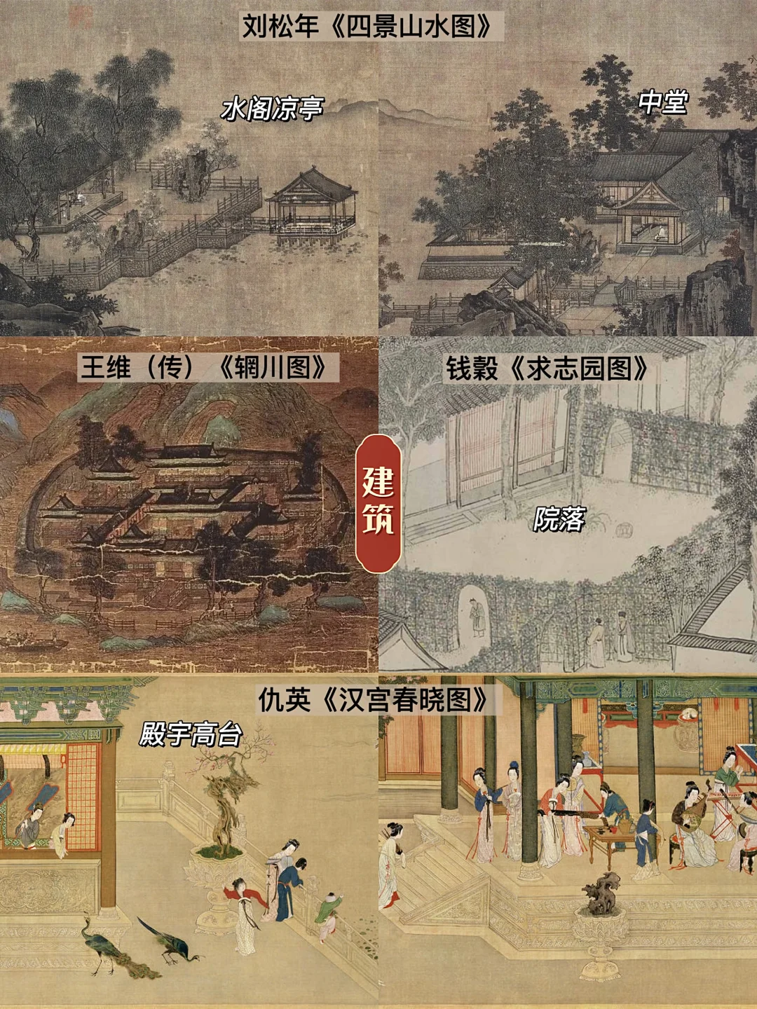 🎋园林的建筑种类也很丰富,在王维的《辋川图》中,墙廊围绕,形似车辋;在刘松年的《四景山水图》中,院落阁房,窗明几净;在钱穀的《求志园图》中,轩堂斋亭,宛自天成;在仇英的《汉宫春晓图》中,高台宫苑,富丽堂皇。