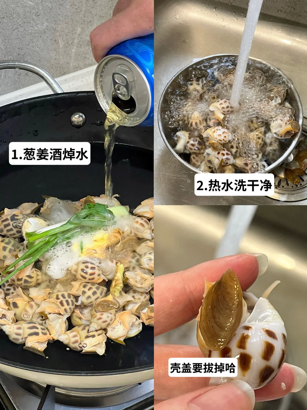 1.花螺加点葱姜酒焯水(不喜欢加料酒,加了点啤酒)
