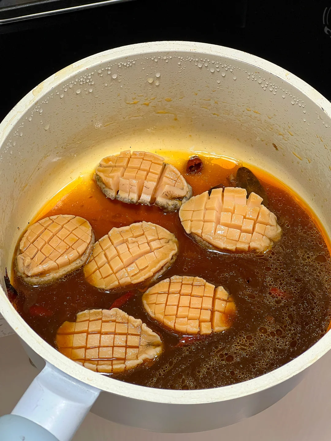 7.鲍鱼花刀,放进汤汁煮三五分钟,Q弹口感