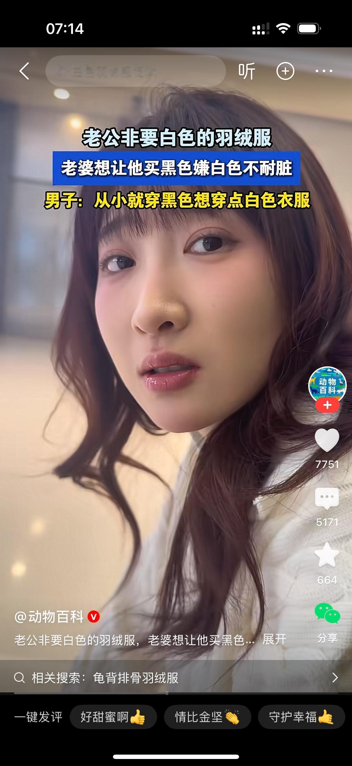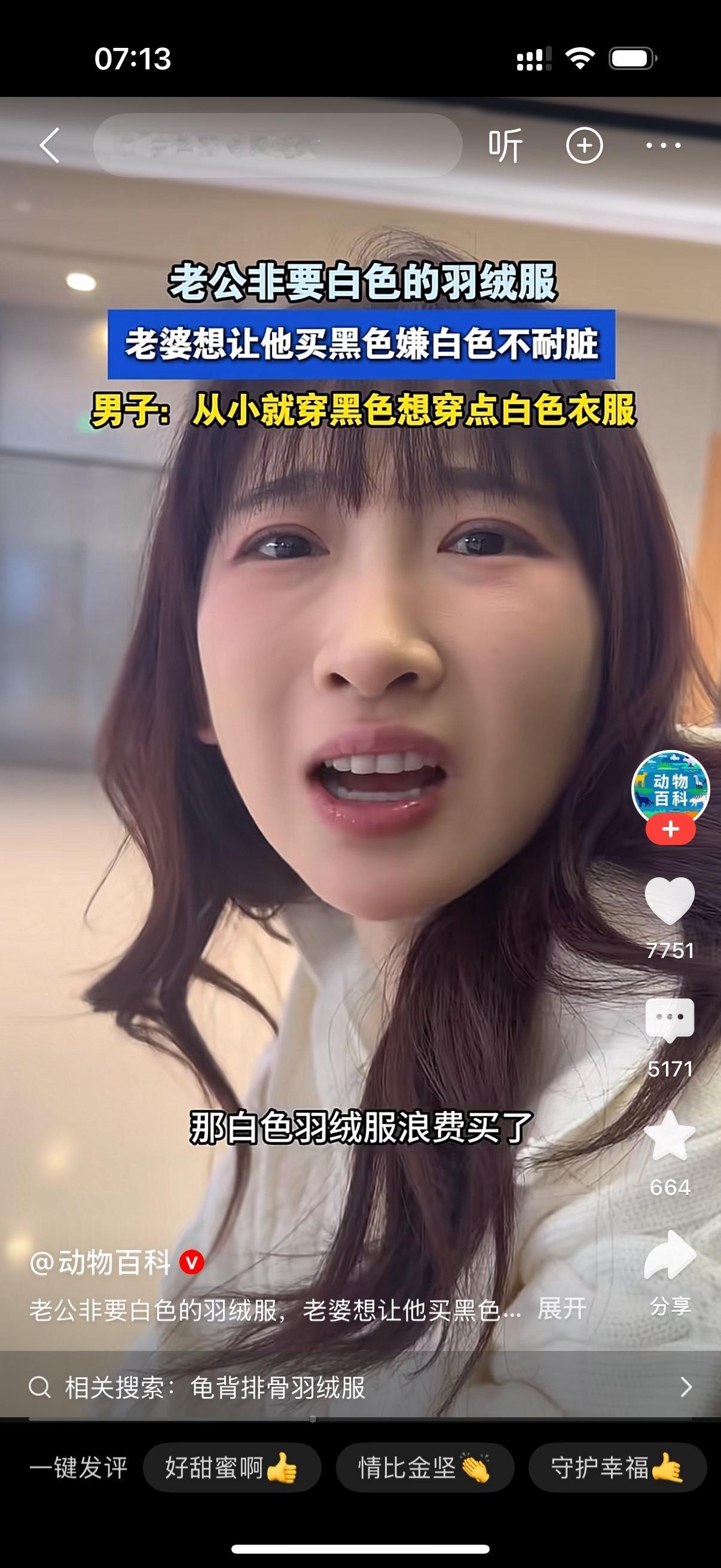 老公非要买白色的羽绒服。妻子不让他买,要他买黑色的。男人说,我就想要白色的。我从小就穿黑色的,连内裤都是黑色的。老婆解释说白色不耐脏,一件羽绒服好几千,动不动就要干洗,每次干洗几十块。男人说你身上穿的不也是白色的吗?老婆说,我这衣服便宜啊,直接丢洗衣机,不用干洗。男人说,那我不买了。女人还无奈,这男人怎么跟小孩一样。