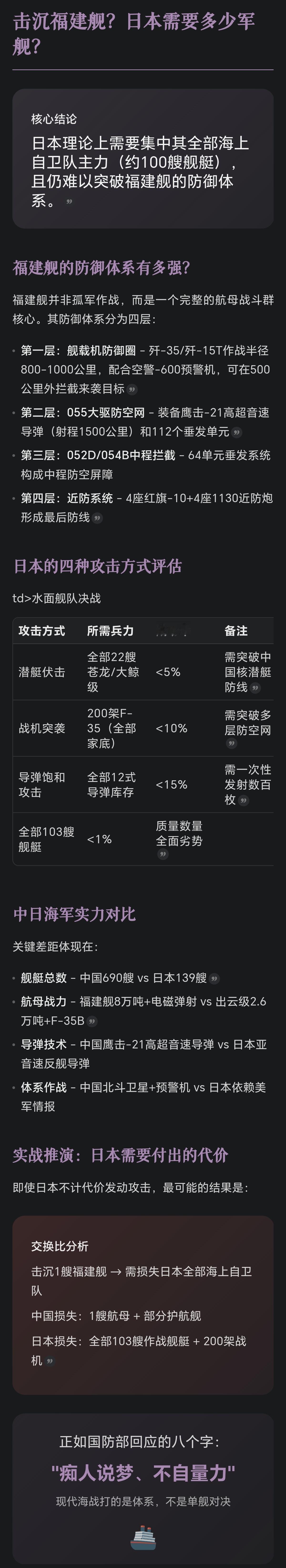 以前咱们说打美国航母,一定有人跳出来反对说美国航母不是一艘船是一整个战斗群,想打美国航母难如登天。 现在我们说打日本,还是这群人跳出来说日本想打我们的航母轻而易举。 那么航母真的很难打吗? 我用AI模拟了一下这样的情况。 AI给我的答案是,日本哪怕出动所有的海上自卫队,才有可能击沉福建舰航母编队。 而且这个有可能的概率并不高。