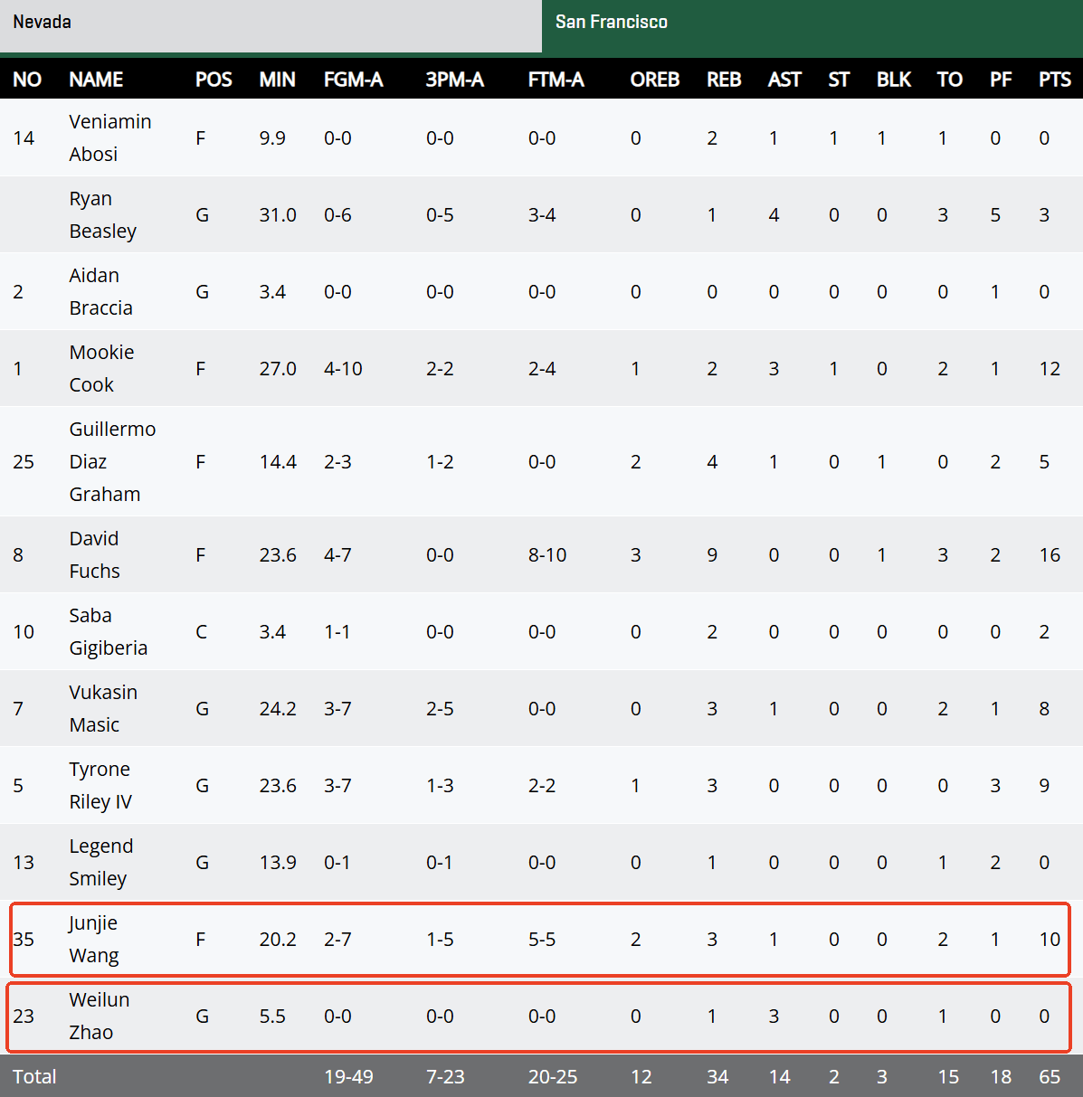 NCAA常规赛:王俊杰10分3板,旧金山大学不敌内华达大学
