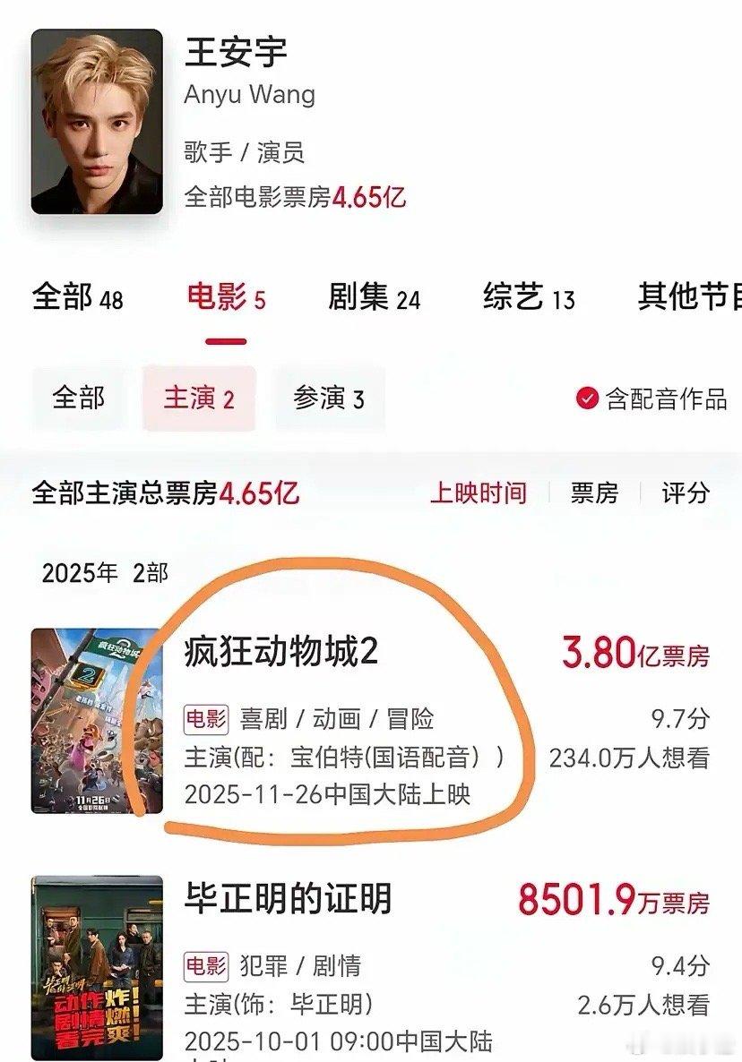 王安宇这运气,那真是没话说。就靠着一部《疯狂动物城2》,个人票房跟坐火箭似的,从