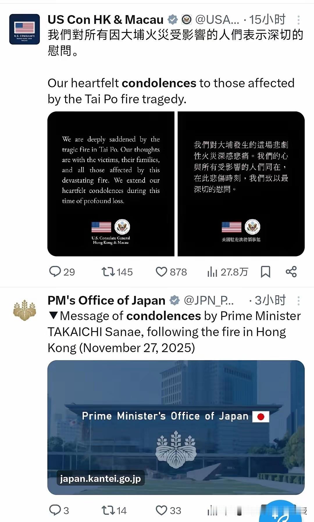 高市早苗还是积极地想缓和中日关系的,看下图,高市昨天就香港大埔火灾发了唁电。 香港大埔宏福苑火灾发生后,阿塞拜疆是公开信息中首个就该事件向中国政府发来慰问的国家。另外,俄罗斯,巴基斯坦等慰问电都发给了中央,这个才符合法定程序,毕竟香港属于中国。其实,高市早苗最应该发函至中央政府,除了对香港大火受难群众表示慰问,也诚挚道个歉,给自己顺势就找了台阶下。
