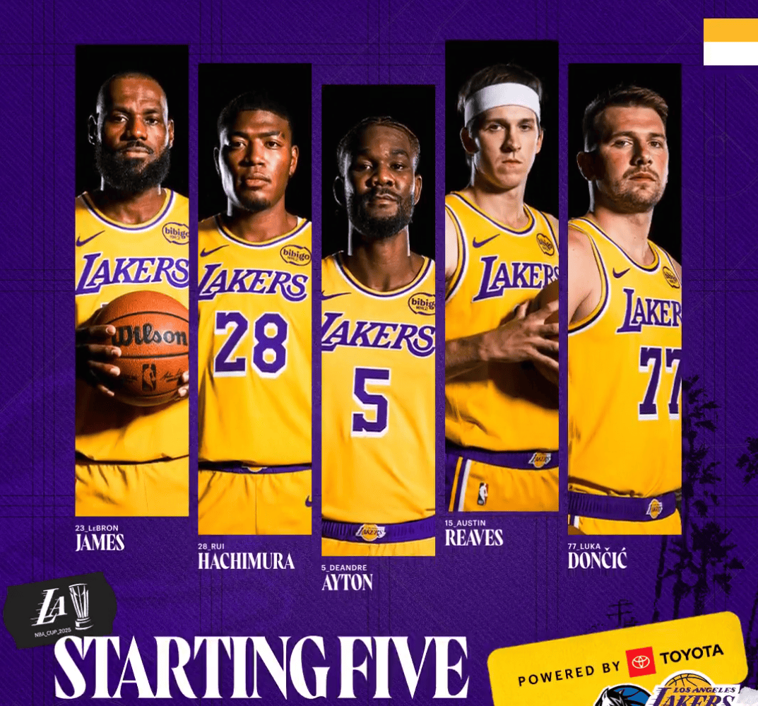 湖人本场首发:卢卡-东契奇、奥斯汀-里夫斯、八村垒、勒布朗-詹姆斯、德安德烈-艾顿。