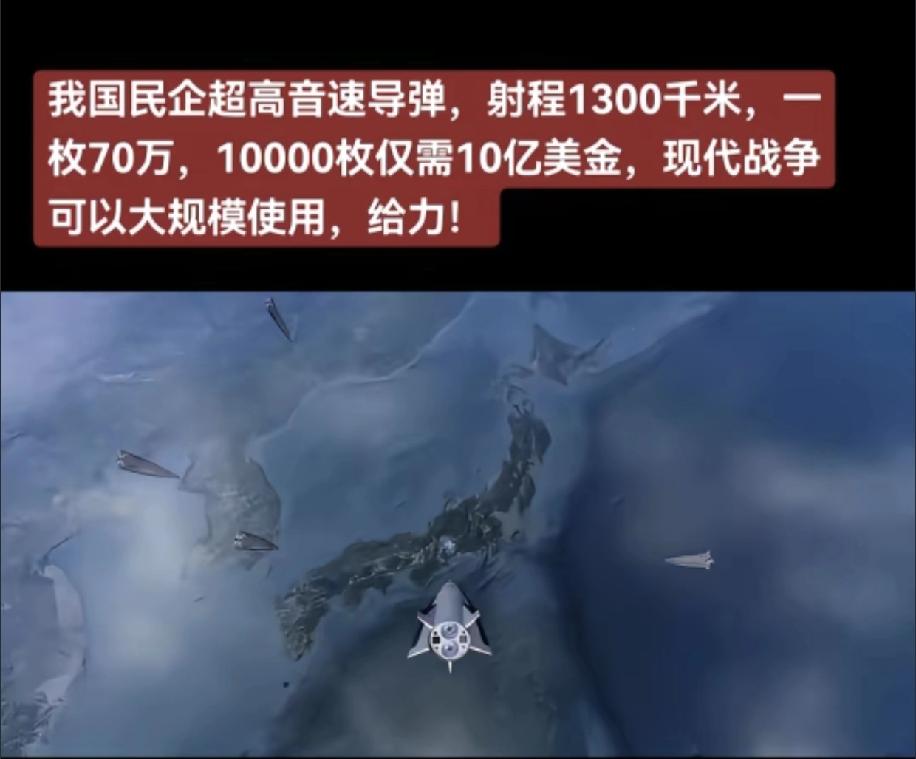 四川民企高超音速导弹出来后,价格才70万元一枚,广大网友坐不住了,问上链接,大家接龙先众筹个一万枚,先给500到1300公里内的所有目标来个覆盖打击量,也可以货轮集装箱变055大驱,渔船也可以变导弹艇,这样子还可以向外延伸。