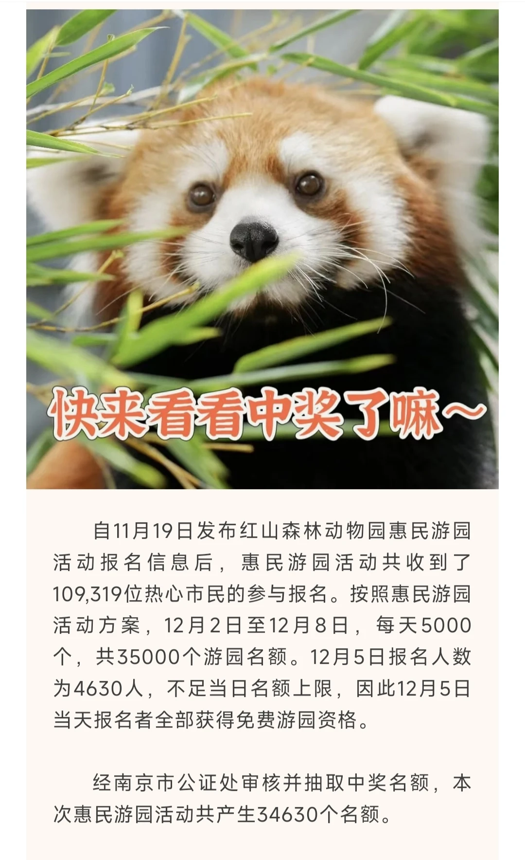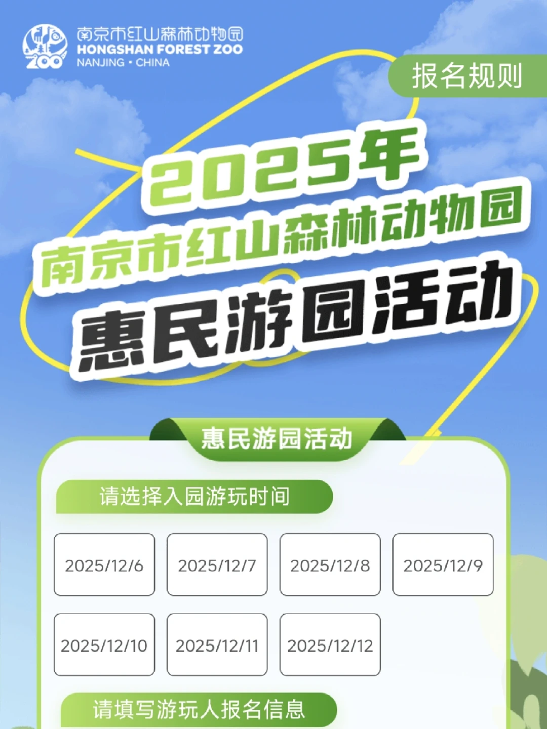 💥连续免费七天!12点截止! 👀2025年红山动物园惠民游园活动你报名了吗? 📆免费时间:12.6-12.12,7天 🆓免费数量:每天5000张,共3.5万张 ⏰报名时间:11.28日12点截止 🖥️报名流程:🛰️南京市红山森林动物园→游园服务→2025年惠民游园→选择时间,填写信息即可报名 🎁结果公布:12月2日公示,届时可以在报名界面查看结婚,成功会收到二维码 📖去年10万多人报名,中签率不到32%,今年南门新区开放,门票调整到70元,大家觉得今年会有多少人报名呢? 🗺️免费开放日其他说明:往年情况仅供参考 ①中签的用户可以带一名免费儿童 ②正常免费的群体当天可以正常参观(不推荐,可以选择其他时间游玩,人少体验感更强) ③官方公布是需要人/码证合一,但实际只需要扫二维码即可,所以懂得都懂(今年以实际为准) ④免费开放日因人数较多,可能会提前半小时开放,早去体验感会略微好些 🚇交通指南: ①地铁1/3号线南京站→南门 可以先去非洲区或者考拉馆 ②地铁1号线红山动物园站→北门 可以先去大熊猫馆 📣更多南京旅游攻略, 还将会持续更新!