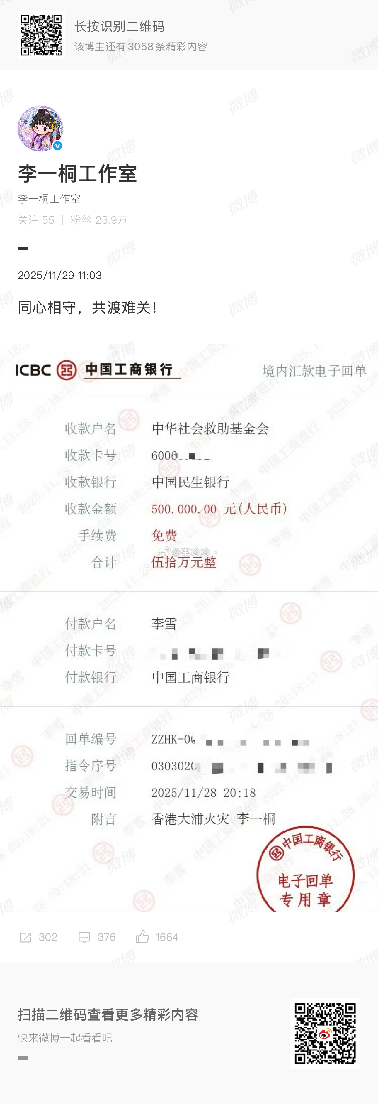 李一桐捐款50万元人民币支援香港大埔火灾救援,她骨子里就是个善良的人啊,李一桐真