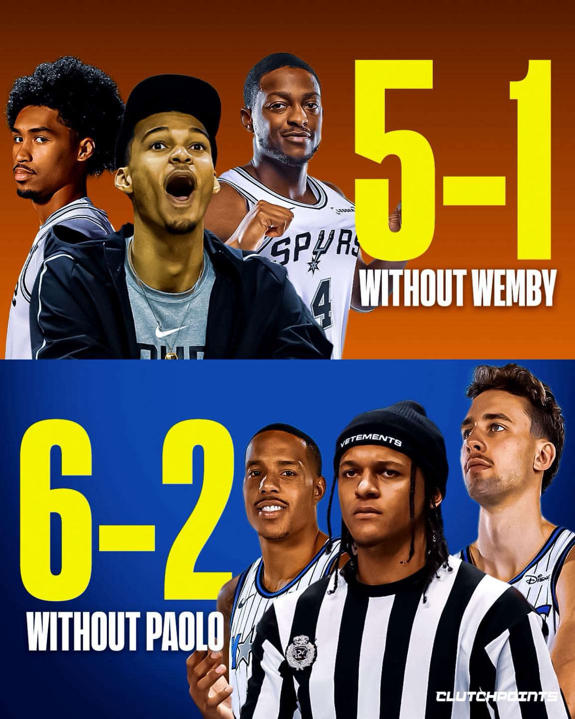 虎扑11月29日讯美媒Clutchpoints官方ins晒出图片,展示了马刺和魔术在缺少当家球星文班亚马和班凯罗时的战绩。