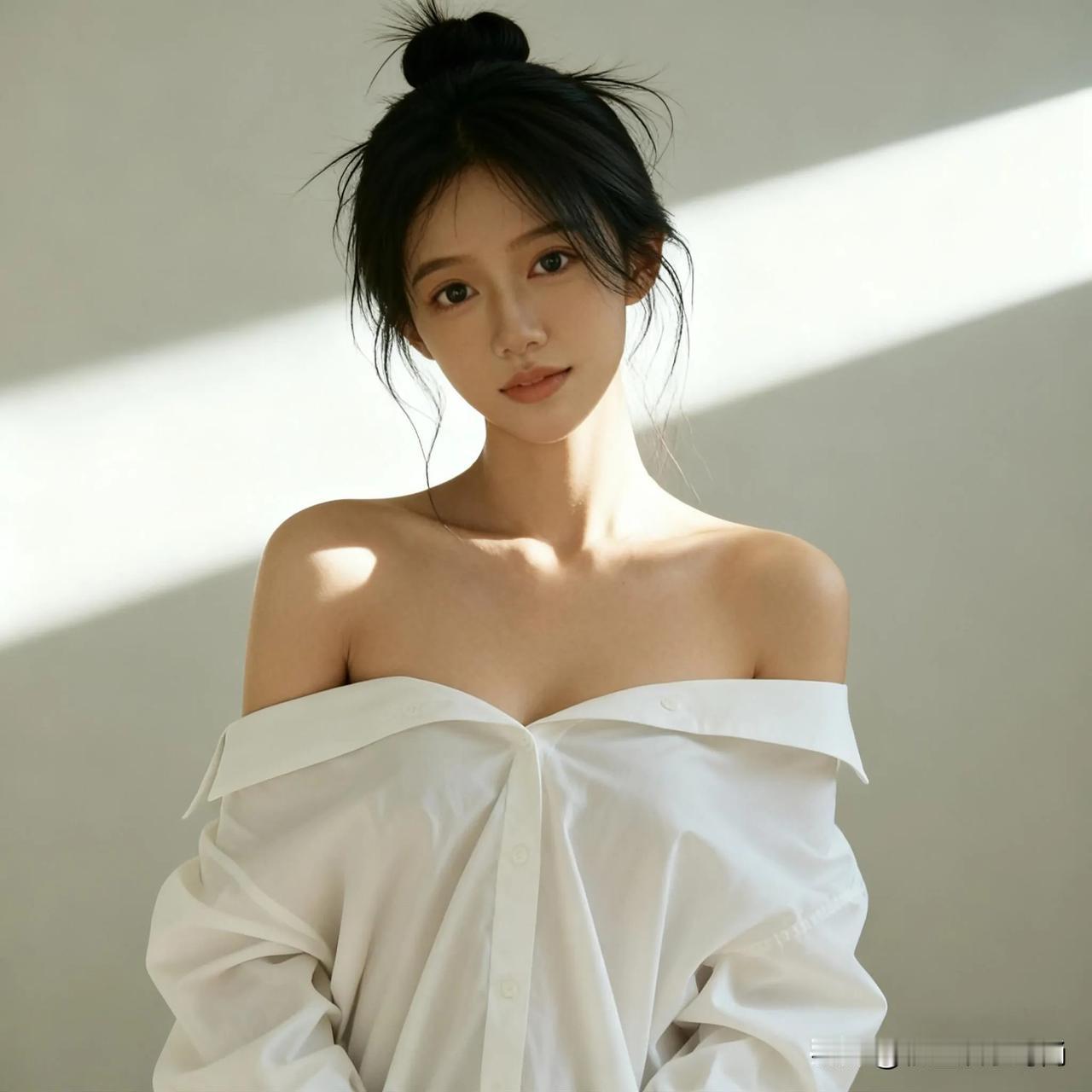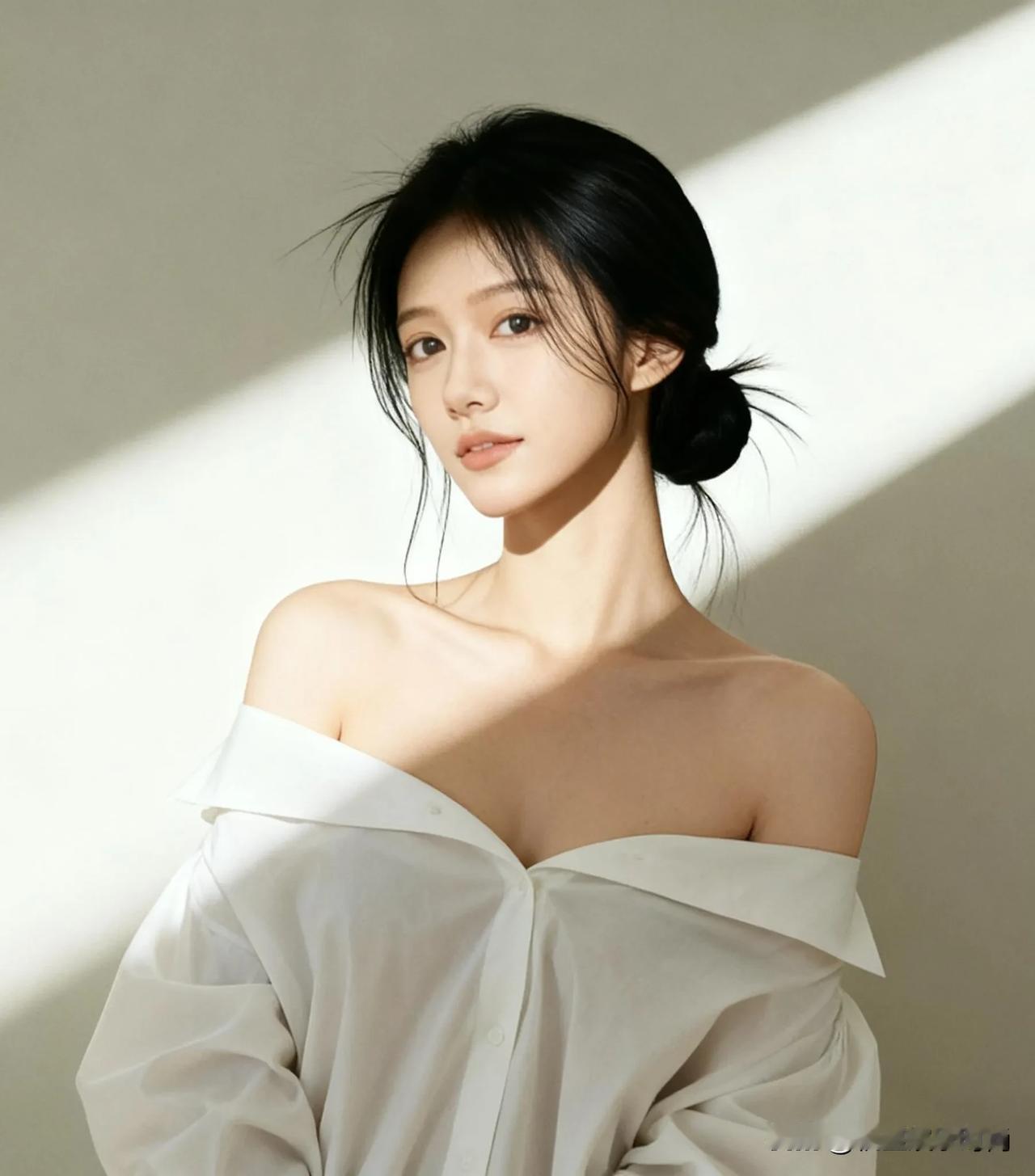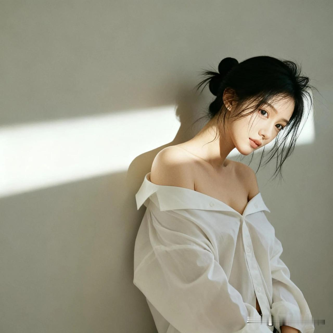她一袭一字肩白衬衫加身,随性而不失优雅。宽松的衬衫自肩头滑落,柔美肩颈线条尽显。简约的设计,在光影的交织下更具质感。低盘发慵懒自然,几缕碎发灵动俏皮,整体造型巧妙融合了慵懒与精致,于简洁之中勾勒出独特的松弛氛围,仿佛在光影里诉说着一种不刻意的时尚态度。