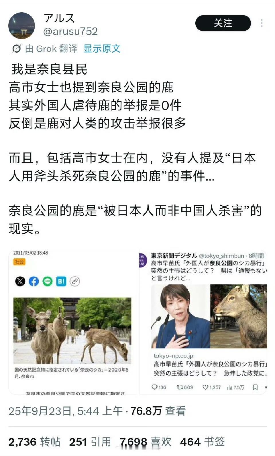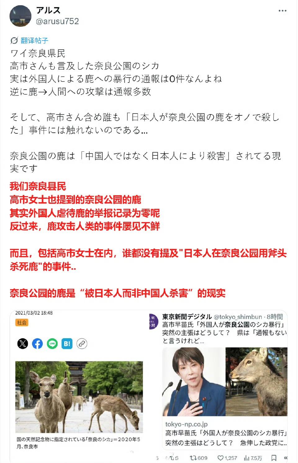 我们这次日本,只用官方手段,却忽略了从民间着手,导致很多普通人觉得太宏大空洞,而日本对我们的攻击都是从身边小事着手,比如这次滨崎步和大槻真希的演唱会,日本正在对我们猛烈攻击。 对,大义方面,我们站在制高点,日本毫无还手之力。但是,民间小节方面,日本做得也很low啊,为什么不抓住攻击呢? 典型的,高市早苗九月竞选时,引用了一个造谣污蔑“中国人虐奈良鹿”的日本网红的视频,虽然她说的是“外国人”虐鹿,没明说是中国人,但她引用的那个网红可是指名道姓地说是中国人,后来被奈良管理方辟谣。 这事,高市早苗办得可比我们取消演唱会磕碜多了,为什么我们就这么放过她呢?