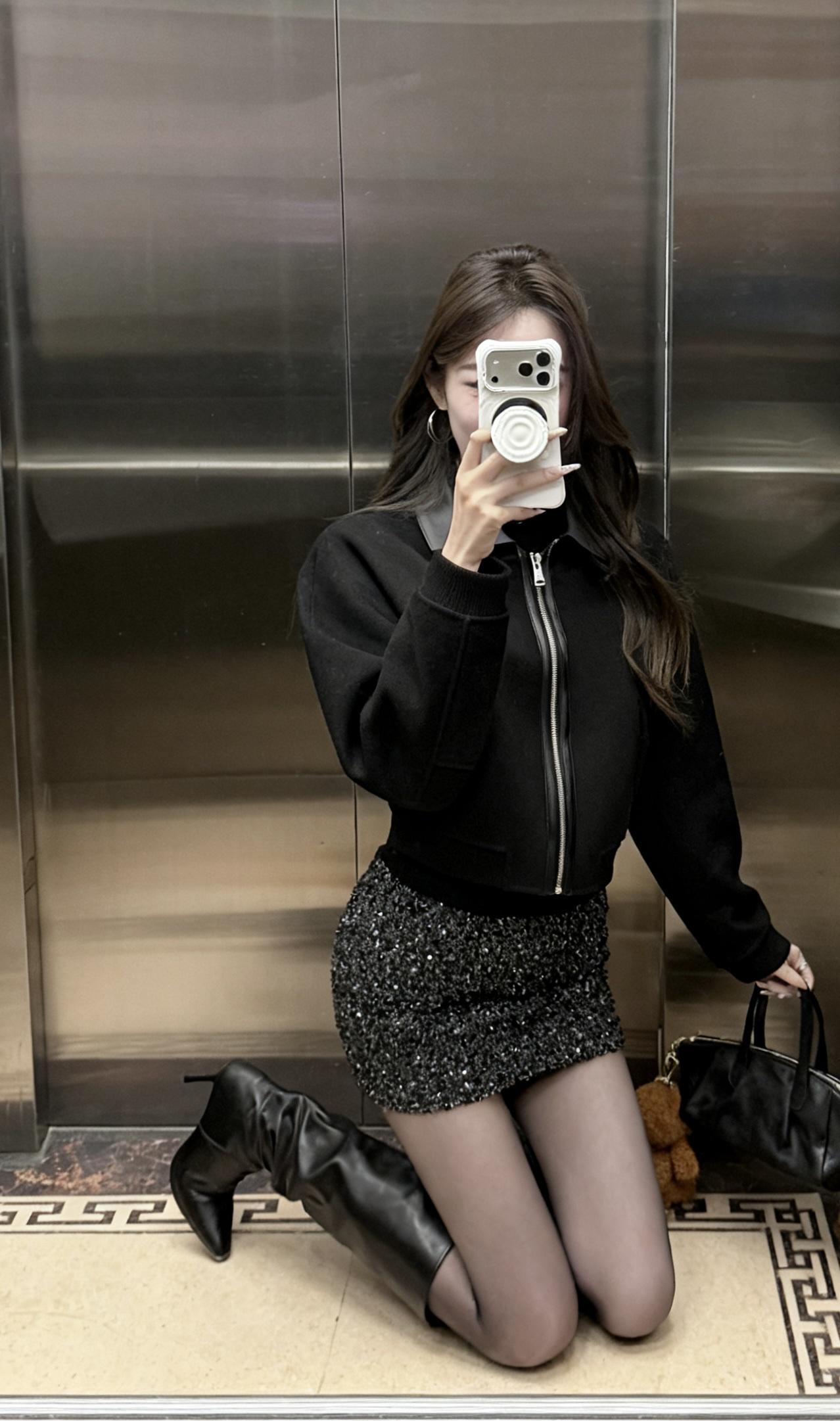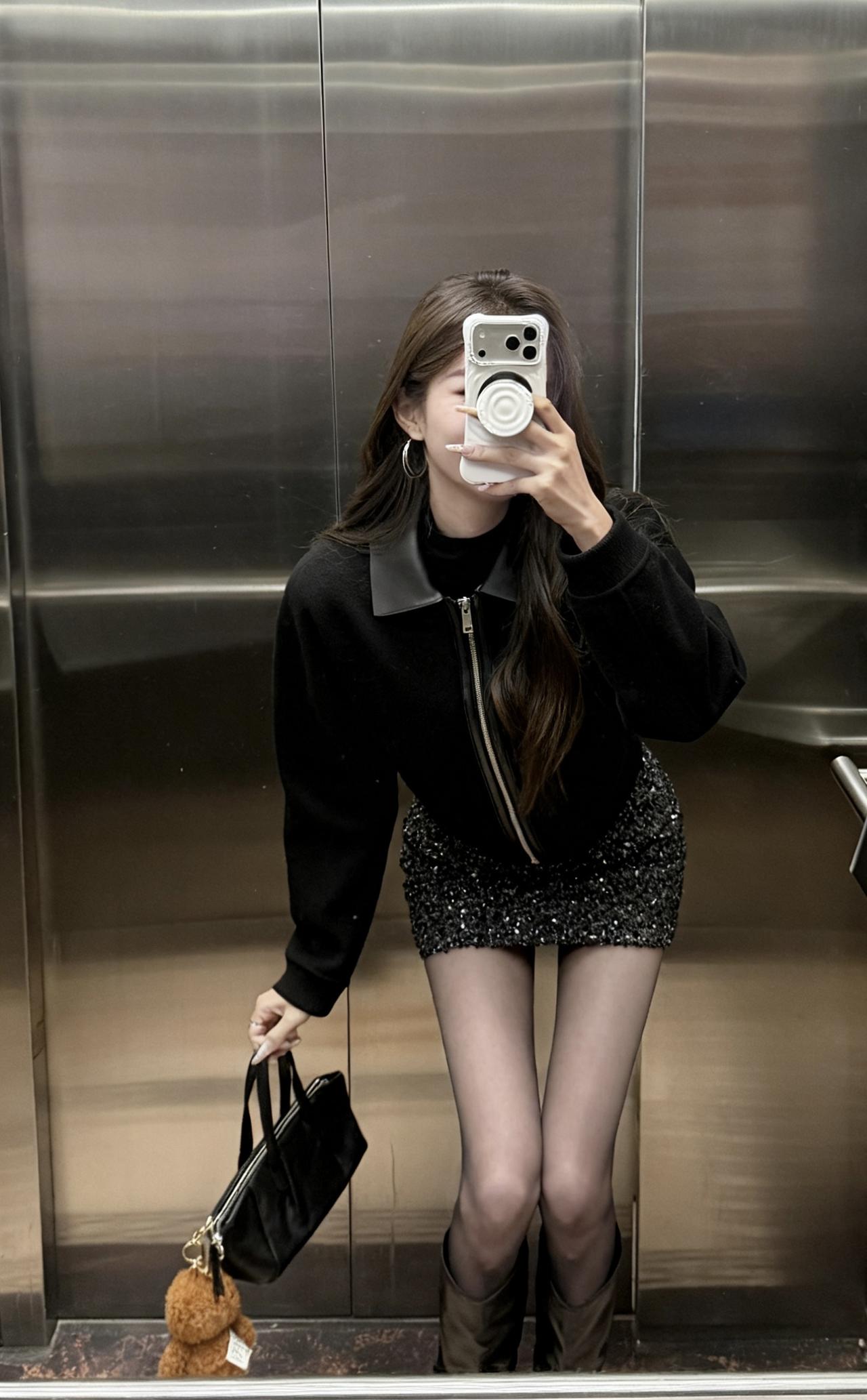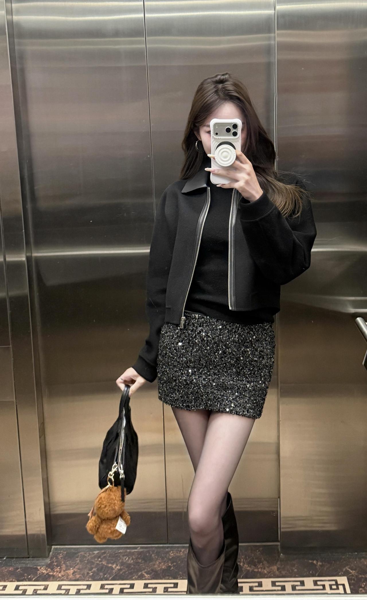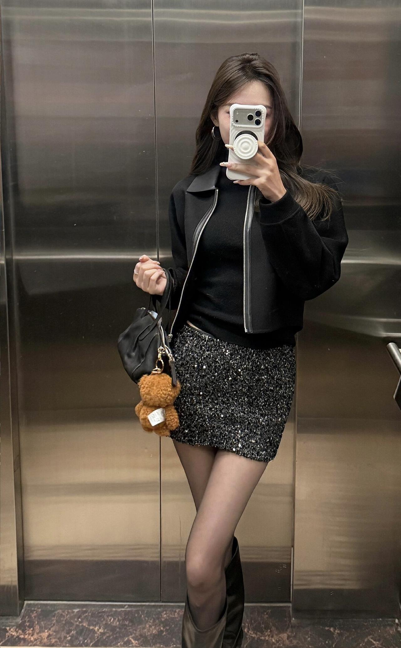 今日穿搭推荐:甜酷休闲风。 穿搭解析: 上身是黑色短款拉链外套(宽松版型+翻领设计,休闲又带点利落感),搭配亮片短裙(blingbling的材质中和了黑色的沉闷,增加了甜美的精致感),再加上黑丝+长靴,既显腿型又强化了“甜酷”的风格,黑色手提包+小熊挂饰则是细节加分项,可爱又实用。 适合场合:日常通勤、出街、约会、探店、下午茶,休闲又有精致感,既舒服又能穿出时髦度。