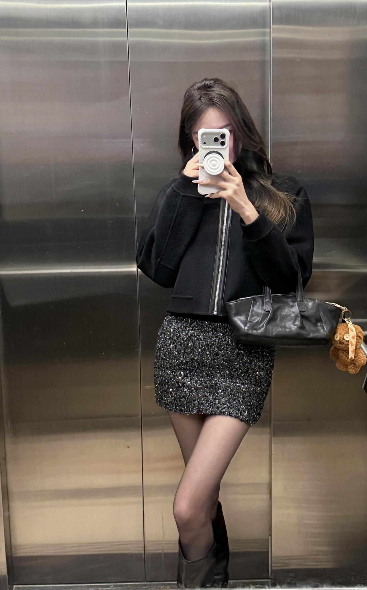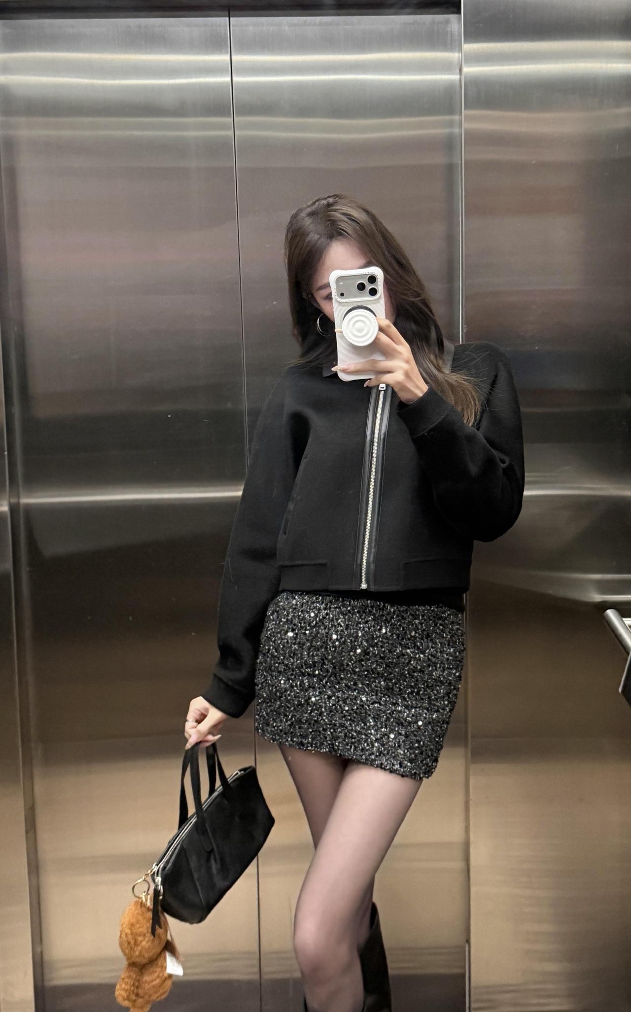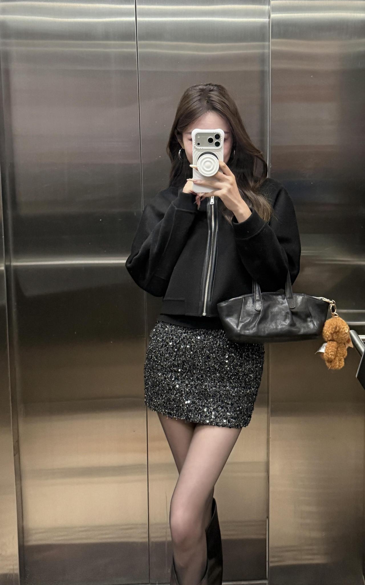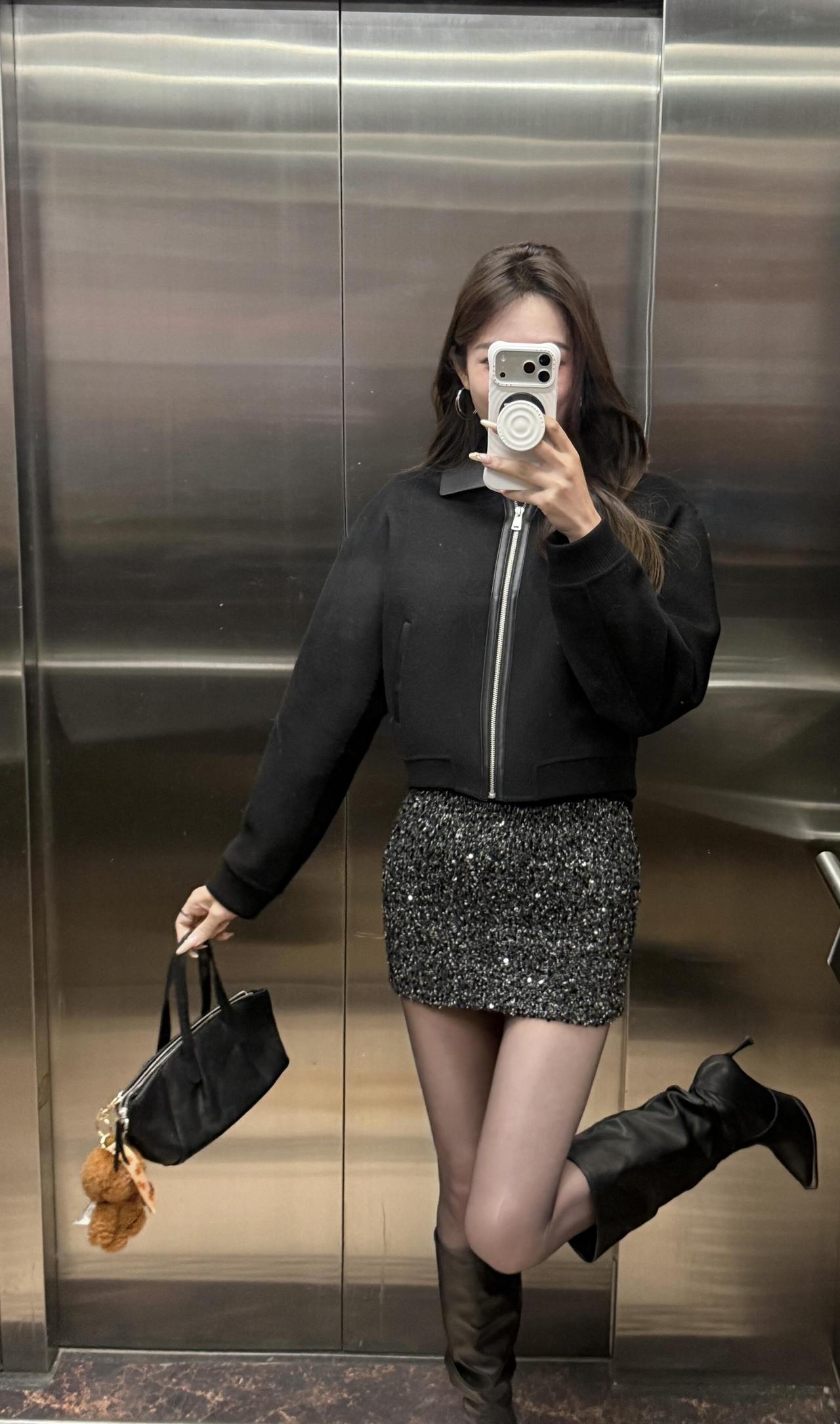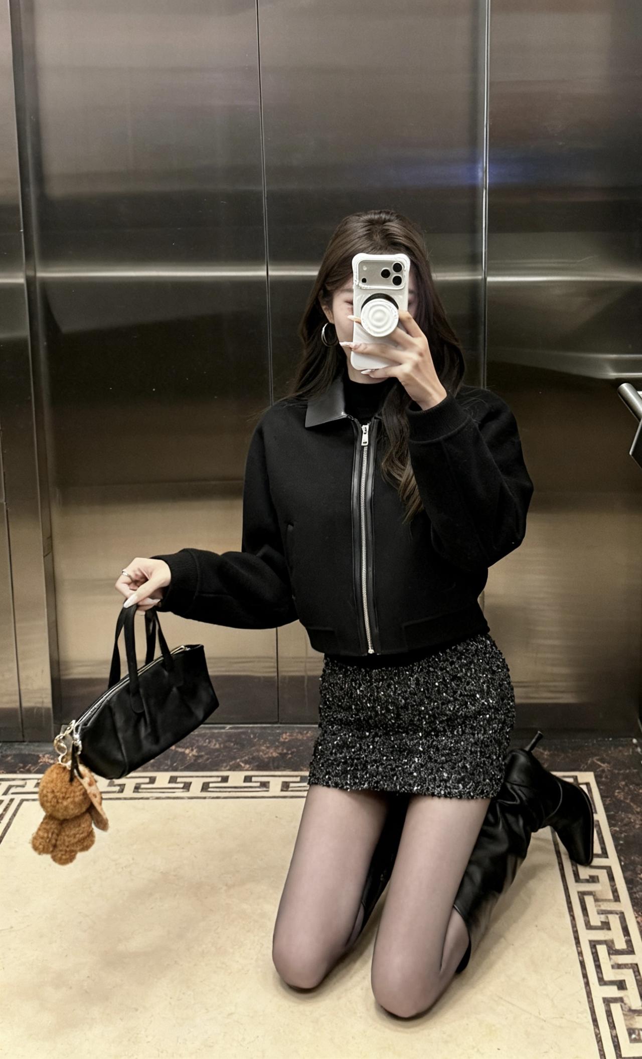 今日穿搭推荐:甜酷休闲风。 穿搭解析: 上身是黑色短款拉链外套(宽松版型+翻领设计,休闲又带点利落感),搭配亮片短裙(blingbling的材质中和了黑色的沉闷,增加了甜美的精致感),再加上黑丝+长靴,既显腿型又强化了“甜酷”的风格,黑色手提包+小熊挂饰则是细节加分项,可爱又实用。 适合场合:日常通勤、出街、约会、探店、下午茶,休闲又有精致感,既舒服又能穿出时髦度。