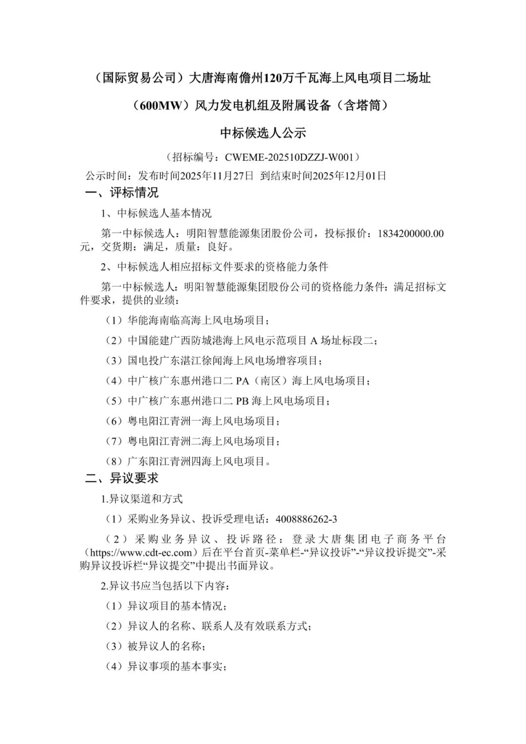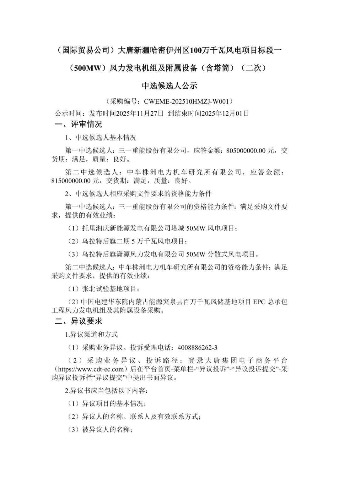 根据公示,三一重能、明阳智能、金风科技作为第一中标候选人预中标。