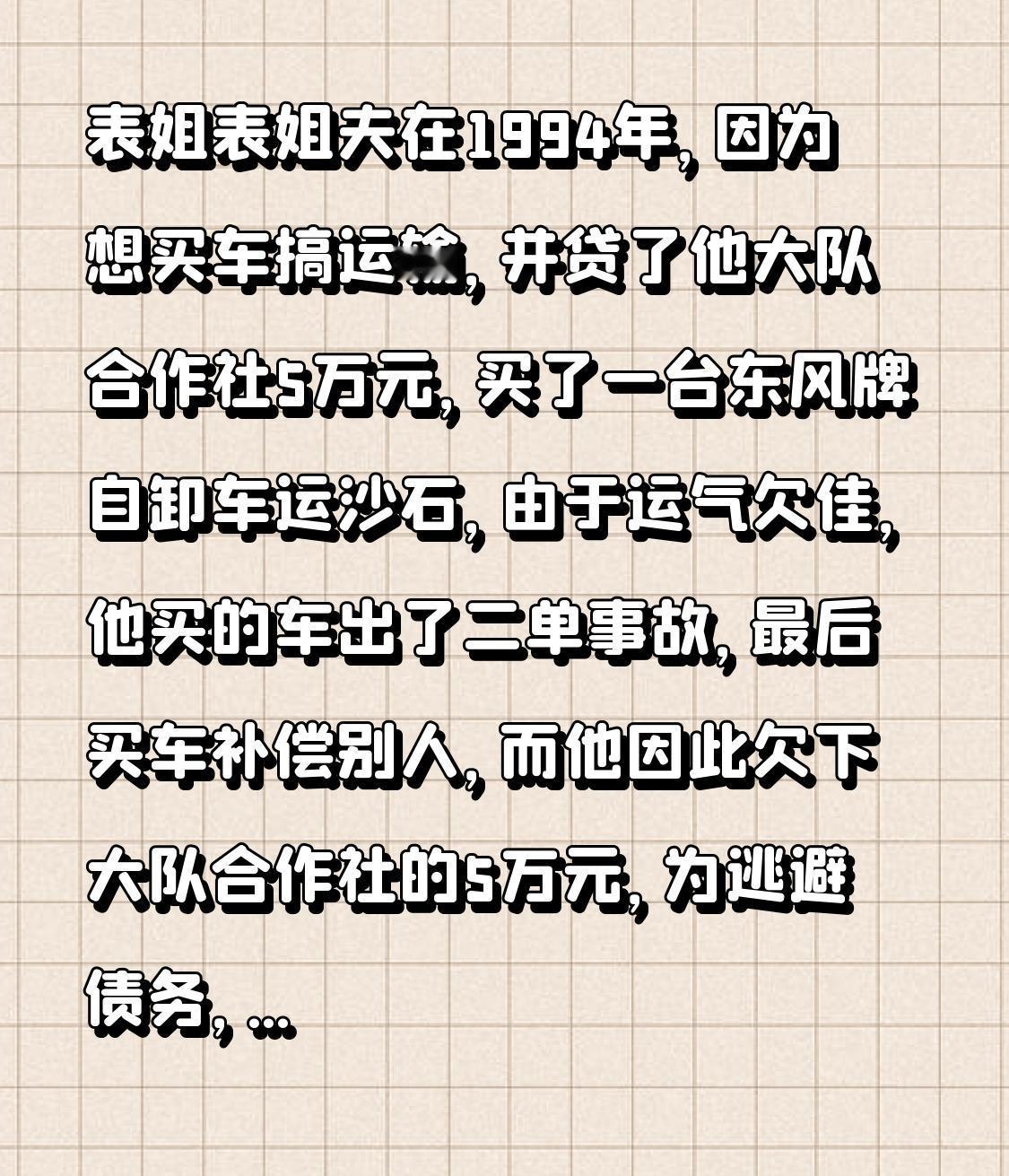 1994年,表姐夫想买车搞运输,便从大队合作社贷了5万元,购置了一台七成新的东风牌自卸车用于运输沙石。 然而命运捉弄人,表姐夫运气不佳,他们买的车出了两单事故,最后只能卖车赔偿他人。如此一来,他们欠下了大队合作社的5万元。为逃避债务,他们逃到惠州小金口的亲戚家落脚。 后来,表姐和表姐夫在惠州小金口当地承包了当地人的土地,靠种菜售卖为生。凭借勤劳的双手,几年后他们赚到了钱,还清了家里的贷款。 在2002年,他们以不到9万的价格买下当地一块180平方的闲置地,并于2009年在这块地上建起了一栋6层半的自建房。 如今,他们每月还有几千元的房租收入。 我的三表姐,这大概就是传说中因祸得福的人了!