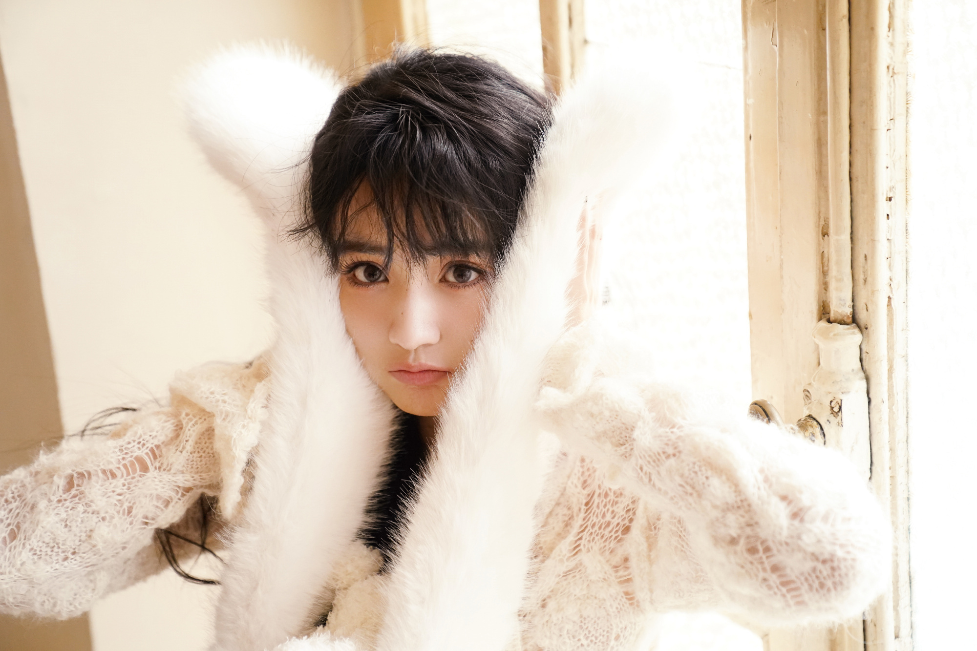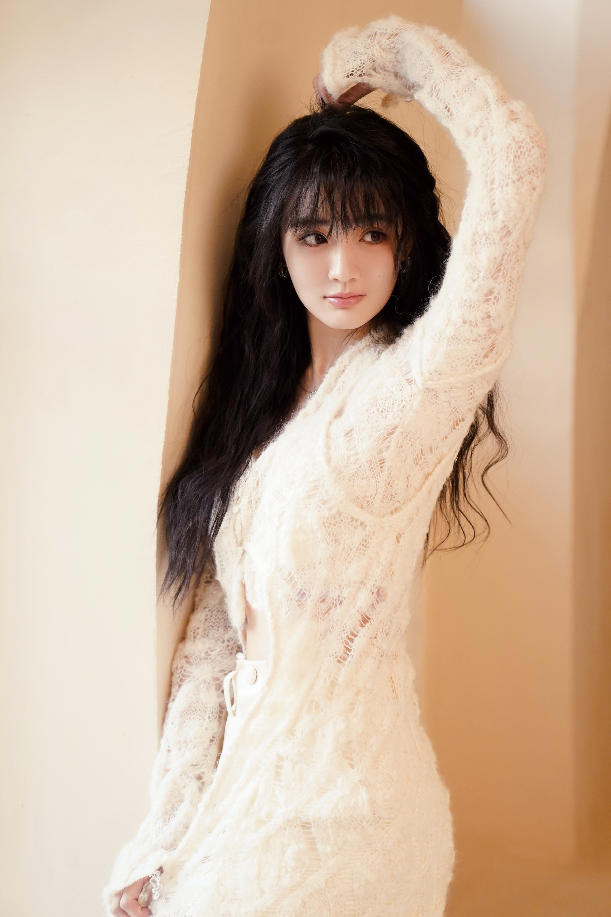 人像摄影,一高挑高颜值美女,侧坐在米白沙发上,五官立体精致,皮肤白暂光泽,穿紧身