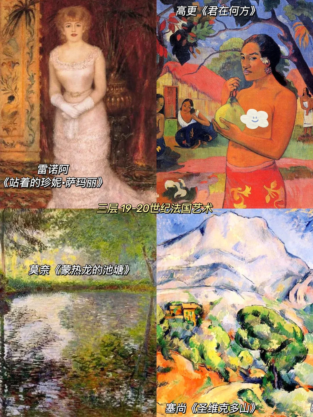 三层囊括了法国的现代艺术发展史。首先是印象派,可以看莫奈笔下闪闪发光的☀️池塘,雷诺阿笔下温润柔滑的萨玛丽。