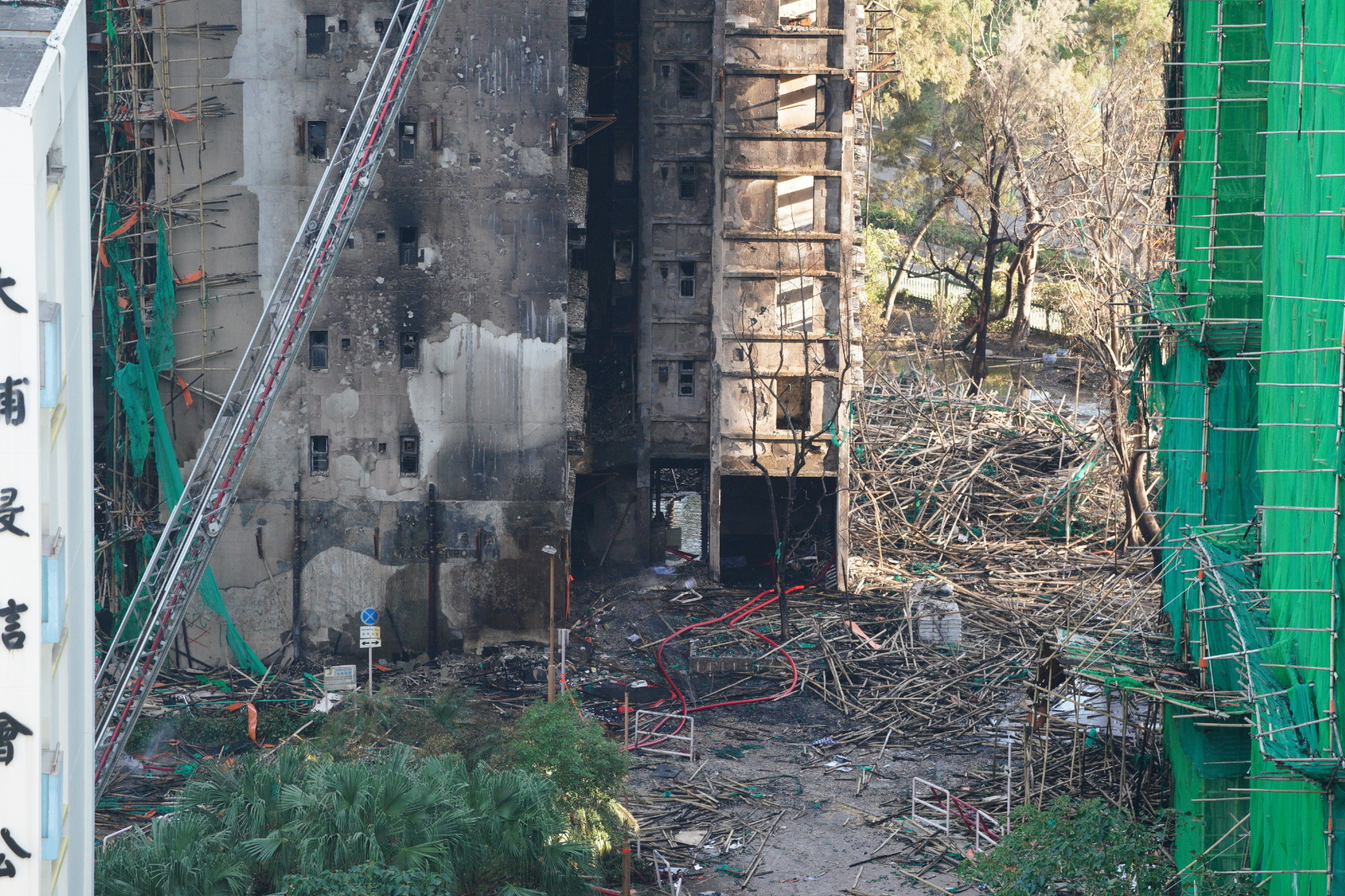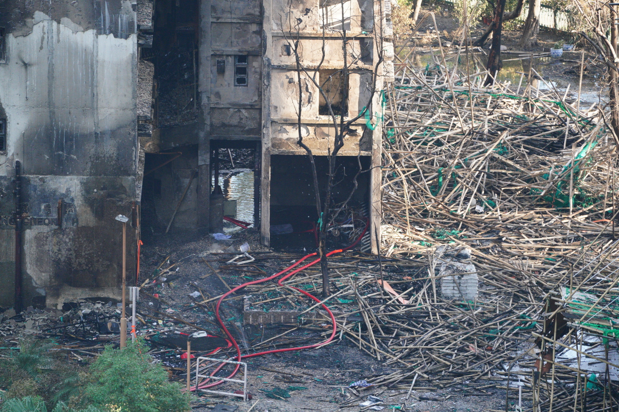 🔻大公文汇网分享的现场照片。🔻许多竹子堆积在地面甚至大楼入口附近。🔻此前,香港特区政府保安局局长邓炳强在新闻发布会上公布初步情况时说:“烧断的竹飞堕令其他棚网起火,令灌救困难,蔓延迅速,高层棚架不断跌,阻紧急出口及大厦出入口,阻消防入楼宇救援”。此前失踪名单中144人确认安全热点现场