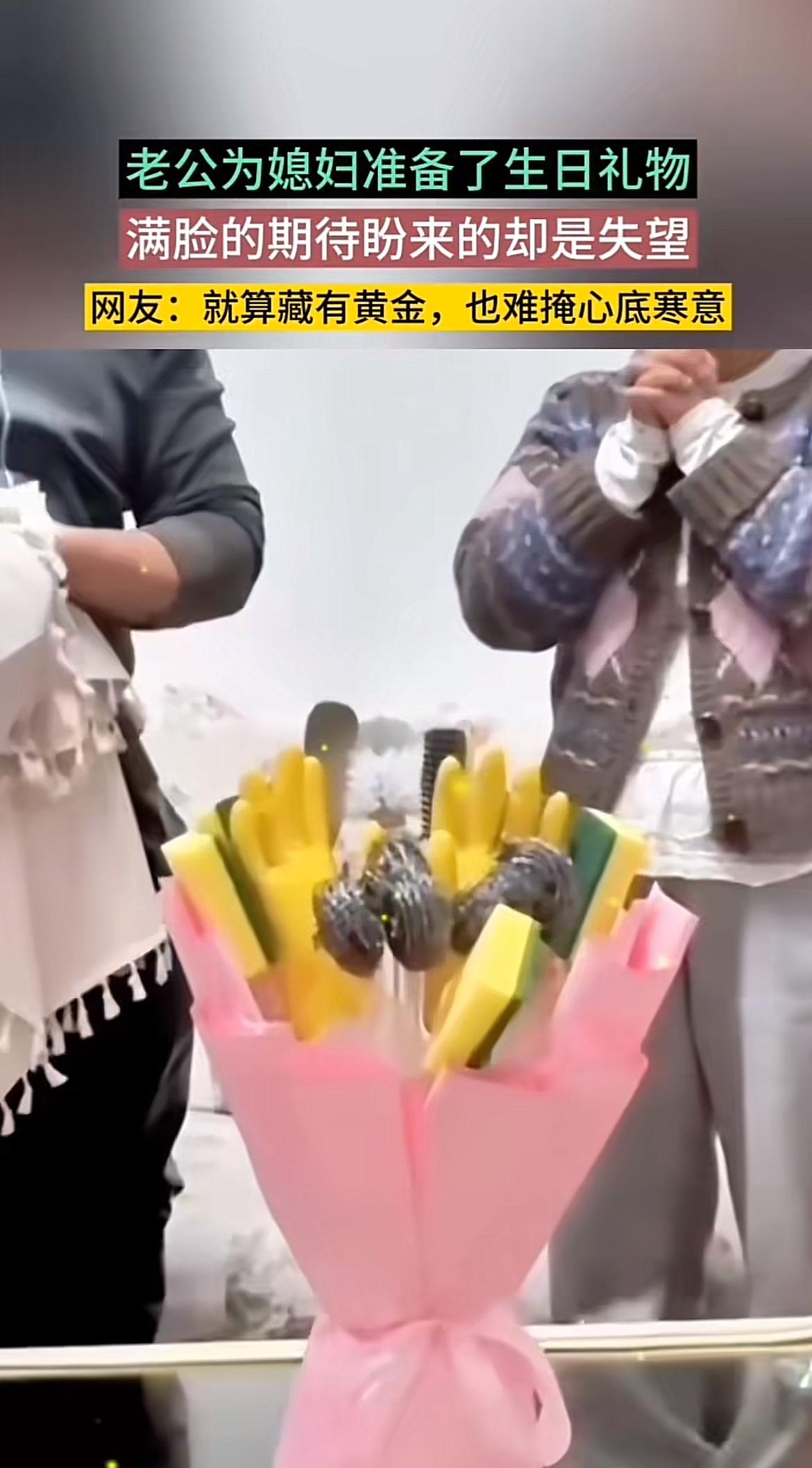 满心期待老公送的生日礼物,结果看到的却是胶手套和钢丝球,这落差感谁懂啊!本以为是浪漫鲜花,结果成了居家用品。就像那过生日被送钢丝球和橡胶手套的妈妈,期待值拉满最后却满是失望。 在婚姻里,礼物本应是惊喜时刻。刚开始老公送足金吊坠,多浪漫细心。可时间长了,忙碌的生活让我们对礼物期待渐消,满心欢喜变成平淡无奇。不过,礼物也是心意,只是这心意也得送到心坎上,不然满心期待就只剩失望了。