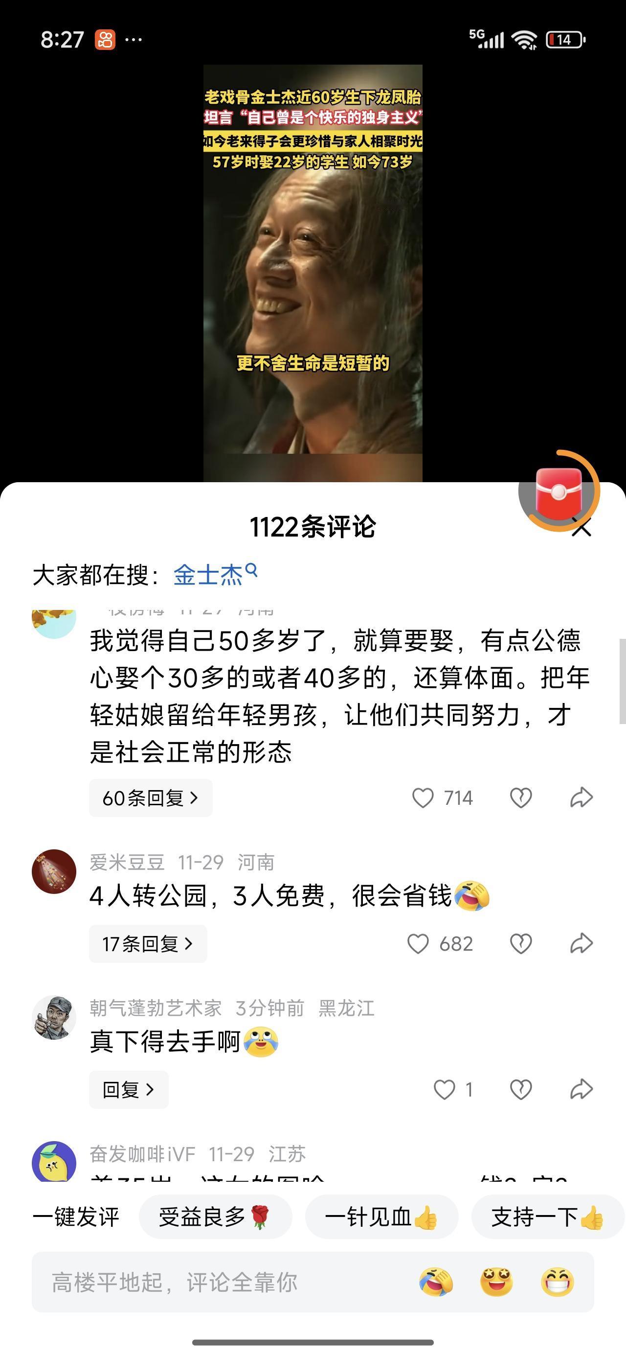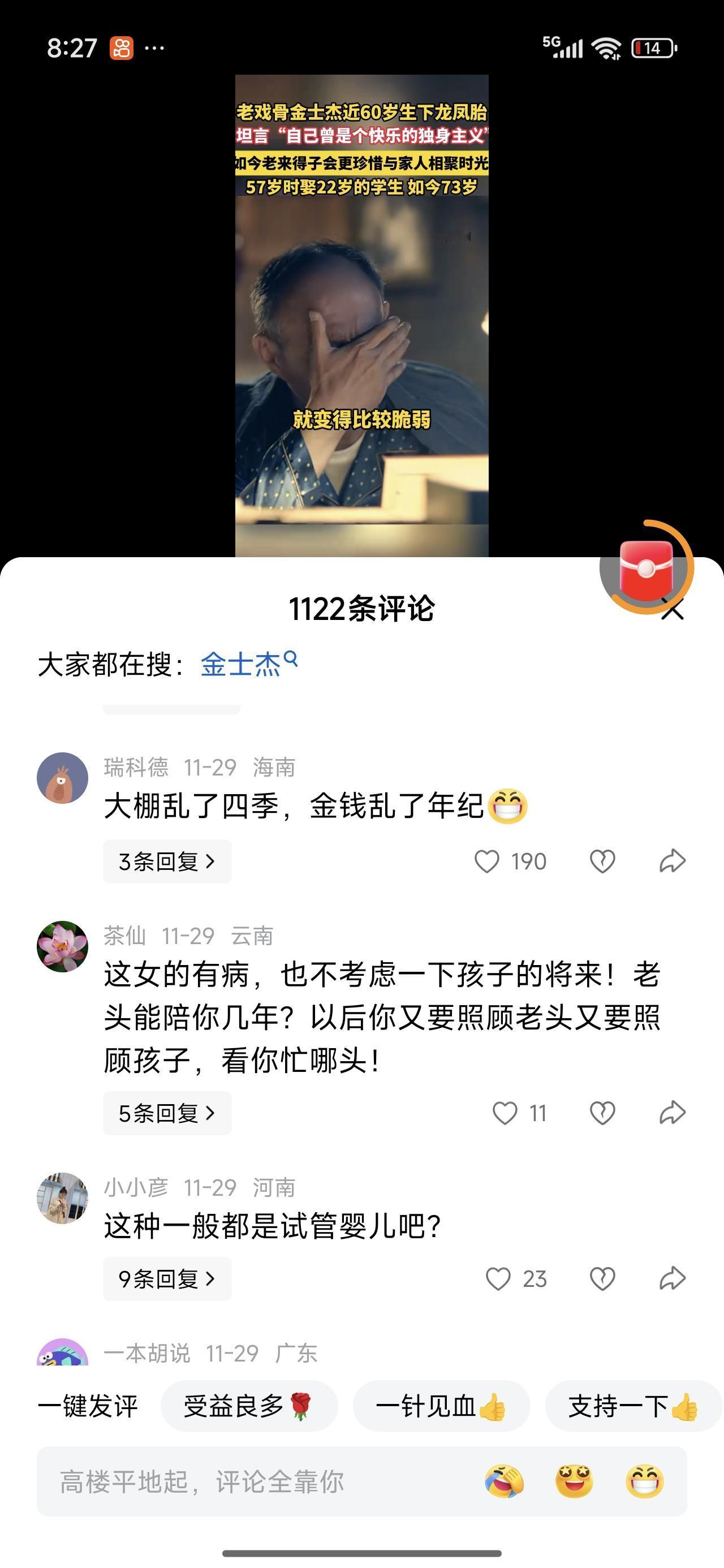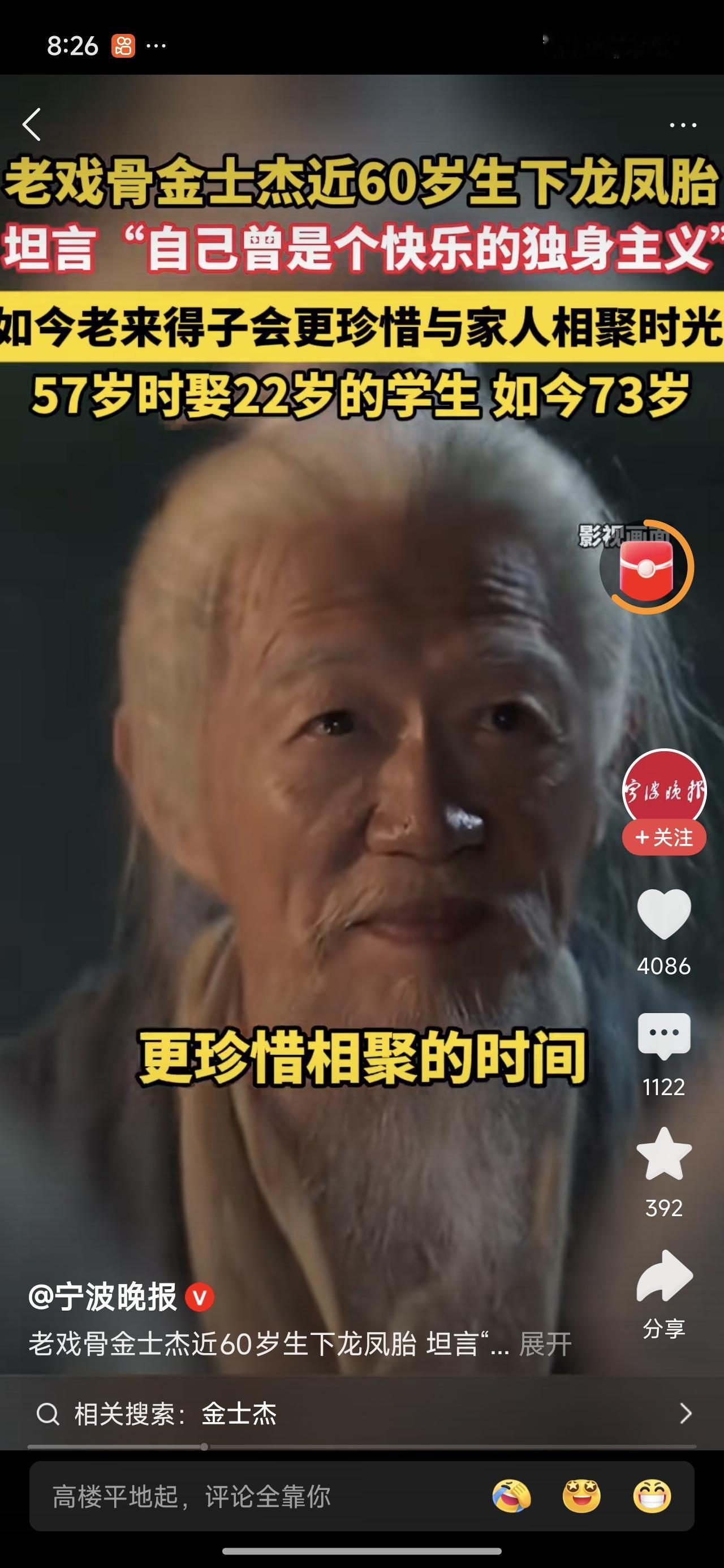老来得子,老蚌生珠。真不容易啊!老戏骨金士杰老来得子,一下还是双生胎一儿一女。57岁娶22岁的学生。如今73岁。 73 84都是坎儿年,还是要多加注意吧! 如今已经白发苍苍。其实老年人,不胖的话脸上都已经干瘪,别说油腻了。油腻的都是中年人。老年人,哪有几个胖子的? 也就是说,有几个胖子能活到老年的。对吧,其实是很难得。所以,没事减减肥吧! 金士杰比张纪中小一岁,都是老年人生孩子。只是,张纪中74了还在生。网上骂声比较多。 原因可能是,他家人的炫耀。炫耀是真的很找骂。你说你再能活,100岁挡住了,陪伴二十年。比正常的孩子陪伴要少一半吧最少。 金士杰说。他本来是个快乐的独身主义者,有了孩子以后比较珍惜与家人相聚的时光。 本质上就是不怕死,怕的是陪伴的时光太短。 人生没有设定的剧本,照着演就行。每一天都不知道会发生什么事。金先生属实有胆了,佩服!