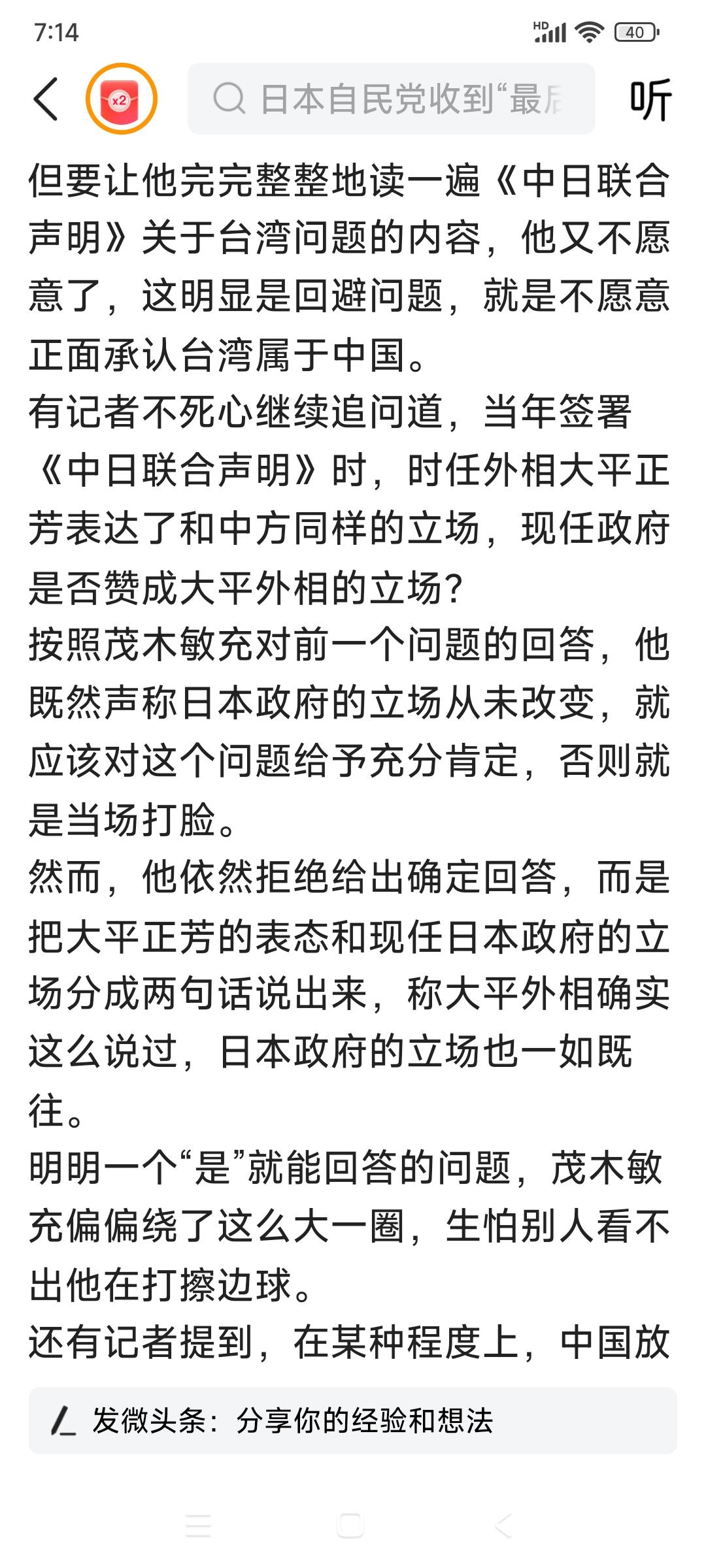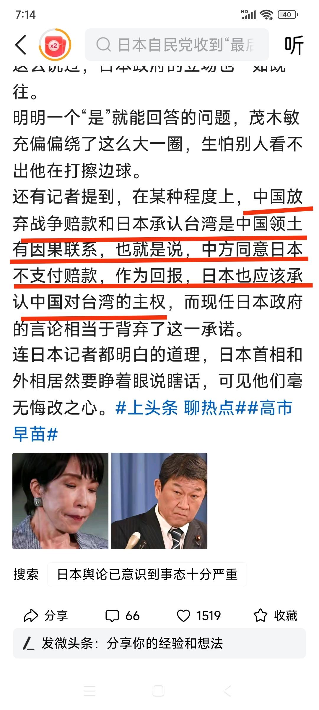 不只一次在视频或文章中看到相关消息,今天又一次看到(见截图3)。 大意是:中方同意日方不支付(战争)赔款,作为回报,日方承认中国对台湾的主权。 我就奇了怪了!《开罗宣言》和《雅尔塔协定》不是已经明确规定,日本必须全部退出通过战争手段掠夺霸占的土地了吗!日本在投降书中不也明确表示将台湾归还中国了吗? 怎么到这里却成了有附带条件的了?难道说,中国不放弃索赔,日本就不承认中国对台湾的主权?作为战败国,日本它敢吗?日本用承认一个它不得不承认的事实,换取不用支付天文数字的战争赔款,凭什么呀? 对于这样的说法,大家怎么看?反正我是坚决不认同的!