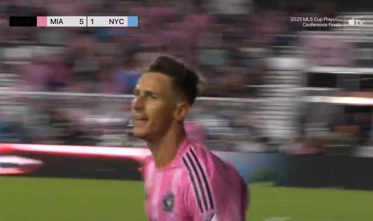 美职联东部决赛,迈阿密国际5-1大胜纽约城,队史首次打入美职联季后赛决赛!梅西送助攻,阿连德帽子戏法,西尔维蒂和塞戈维亚各入一球,阿尔巴奉献绝妙脚后跟助攻!看完比赛你不得不说的三点: 一是梅西罕见的全场0射门,0次过人成功!这和纽约城针对性的防守有关,也和梅西的状态有关,经过了连续多场的强势表现后,偶尔一场发挥一般也属于正常!即使表现一般,梅西也送出了一次助攻,全场有3次威胁传球! 二是即将退役的阿尔巴和布斯克茨又可以多踢一场了!告别战踢美职联季后赛决赛,没有比这更好的安排了!阿尔巴本场真是拼尽全力,塞戈维亚打进的那一球,他从后场一路飙车赶到前场,随后和塞戈维亚完成精彩的撞墙配合,脚后跟送出助攻,这球应该是这场比赛最精彩的一球了!布斯克茨本场在后场防守中没有犯错,这就是对球队最大的贡献,当然他在后场的传接球、疏导组织依然还很顶,两次长传全部到位,阿连德第一个进球就来自他的后场长传!希望这两人可以有个完美的结束吧! 三是阿连德这赛季的成长,长期关注迈阿密国际的球迷有目共睹,从赛季初的各种浪费单刀球经常被球迷喷,到现在单刀球超稳,射门也越来越靠谱!迈阿密国际在梅西不进球的时候,阿连德成了球队最稳定的得分手,这赛季能打进季后赛决赛,他的功劳也不小!两位小将西尔维蒂和巴罗给迈阿密国际的阵容带来了活力,当然经验不足、有时失误太多也是他们需要提高的地方!