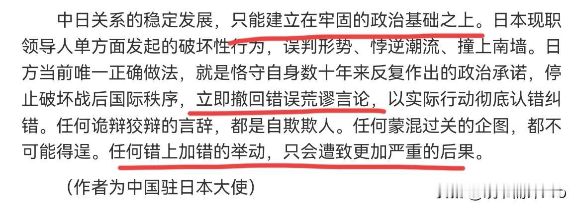 把话已经说的很直白了!日本的回应,我们非常不满意!我们驻日大使吴江浩明确表示,错上加错,日本的行为只会遭致更加严重的后果。11月30日,我们的驻日大使吴江浩刊文表示,中日关系的稳定发展,只能建立在牢固的政治基础之上。日本现职领导人单方面发起的破坏性行为,误判形势、悖逆潮流、撞上南墙。 日方当前唯一正确做法,就是恪守自身数十年来反复作出的政治承诺,停止破坏战后国际秩序,立即撤回错误荒谬言论,以实际行动彻底认错纠错。任何诡辩狡辩的言辞,都是自欺欺人。任何蒙混过关的企图,都不可能得逞。任何错上加错的举动,只会遭致更加严重的后果。 很显然,我们的大使把话说的非常清楚,中日所有关系的前提的就是中日两国之间的政治关系。政治关系是地基,如果地基不稳,中日文化,科技,经贸,金融,军事等关系将会地动山摇。对于高市早苗的行为,毫无疑问,我们的认定就是此人已经在冲击中日关系的根基。而高市早苗已经展现的态度,我们非常不满意。 我们把话说的很明白,不撤回,有严重后果,撤回,中日关系或许有回旋余地,怎么做,就看高市早苗本人的态度。我们以日本现职领导人称呼高市早苗,这一方面表明,高市早苗的话代表日本国家立场,绝非普通的个人言论范畴,高市早苗不可能有甩锅卸责的余地。另一方面表明,高市早苗也仅仅只是现职而已,日本国内的政治力量,应该施加压力督促高市早苗改正错误。话已经说到这个份上了,我们反制的手段估计也将择机一个个拿出来。