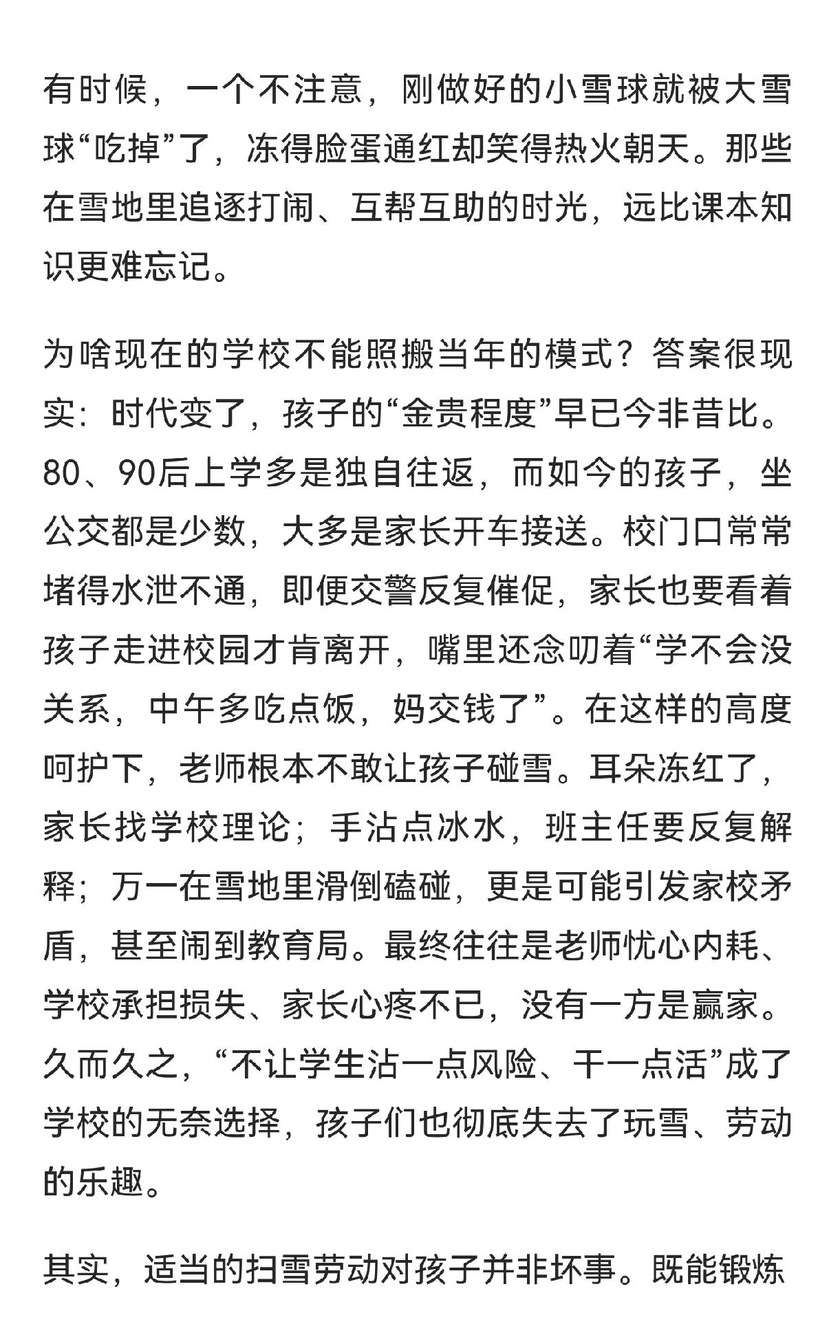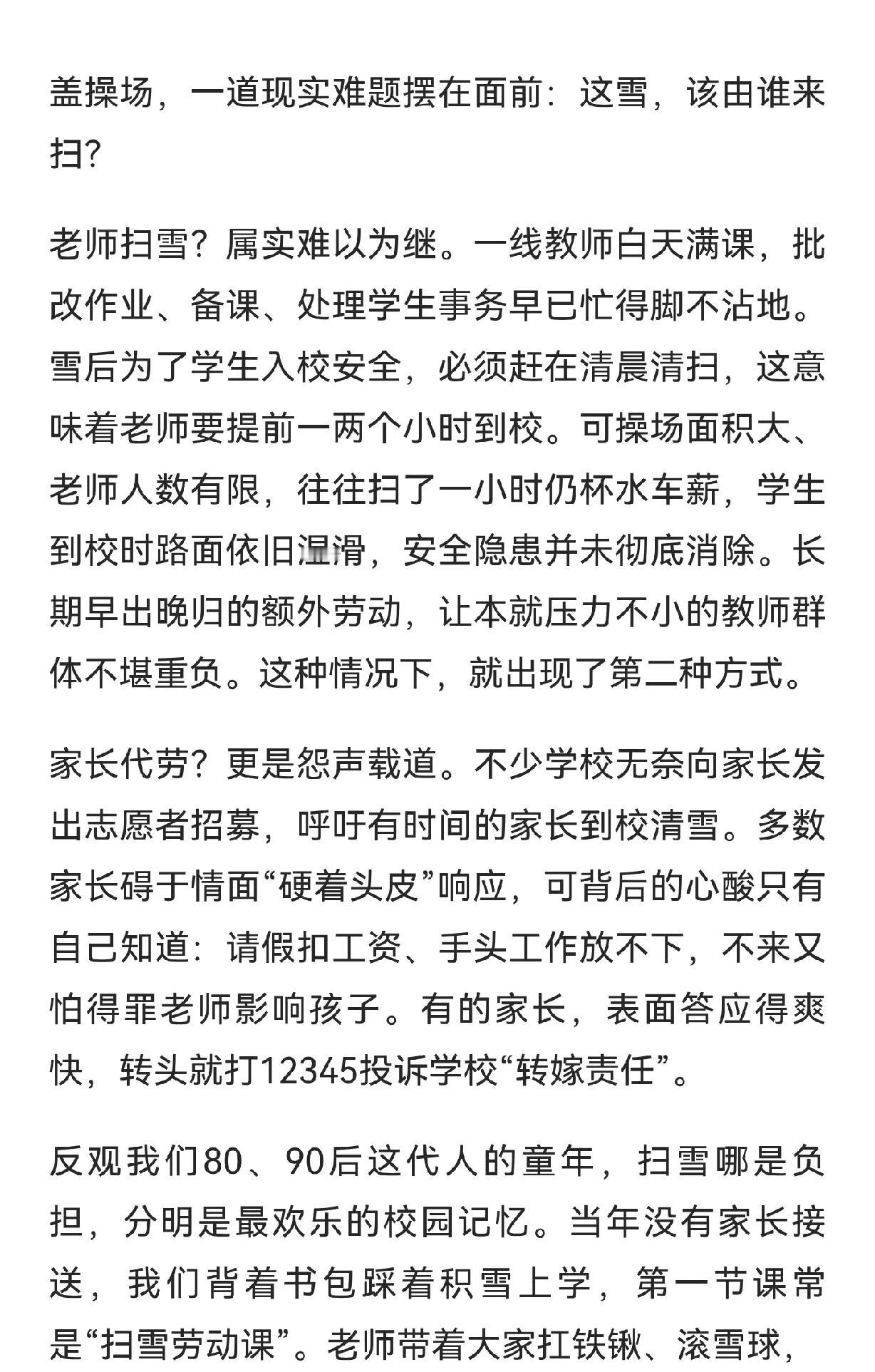东北扫雪困局:老师、家长、学生都抱怨。 南方人真的很难体会这种心情,因为毕竟需要扫雪的状况一年也难得一次,所以遇到这种事情不要太兴奋。就好比现在天天大鱼大肉,看到满桌的菜都提不起胃口,不像小时候,有的菜过年或者喝喜酒才能吃到,所以看到就流口水了。 不过这种事情,个人觉得还是学生扫有意义,家长哪有这么多功夫。