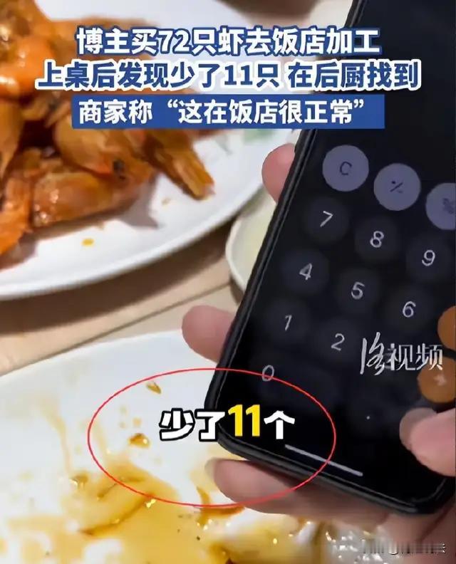 游客自带72只虾加工少11只,饭店称“正常”引众怒 山东青岛一游客自带72只虾至海鲜代加工饭店,上桌后清点仅剩61只,缺失11只。游客当即冲进后厨,找回失踪的9只虾,剩余2只去向不明。面对游客质问,饭店老板竟称此类情况“很正常”,态度敷衍,该回应引发舆论强烈不满,饭店被推上风口浪尖。海鲜代加工缺斤短两涉嫌侵犯消费者权益,商家漠视诚信的行为既违背经营底线,也伤害城市旅游口碑,亟待监管介入规范市场秩序。 素材取于网络,侵权删除。