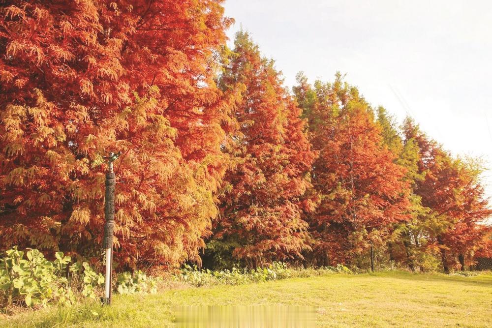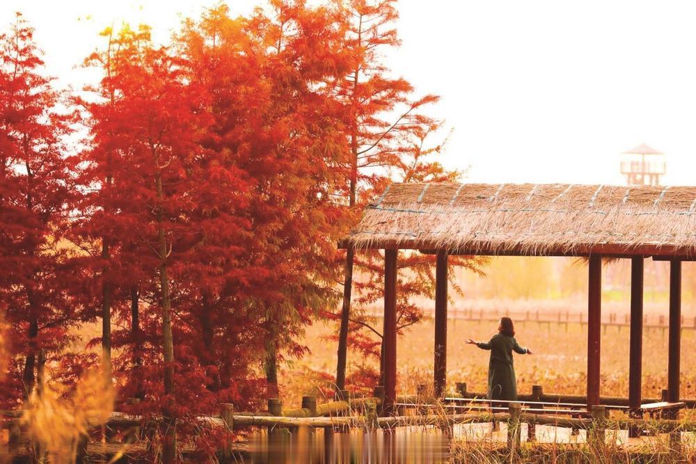 沿着蜿蜒的木栈道走向湖心亭,另一番景致悄然映入眼帘——那是落羽杉,深橙、绯红与浅褐交织,层层叠叠,宛若打翻的调色盘。落羽杉因羽状枝叶而得名,挺拔的树干犹如一支支插入湿地的巨笔,蘸取霞光与冬色,在天地间作画。阳光穿过细密的叶片,滤出暖意融融的光影,落在脸上,也映进心里。初冬,正是它最美的时节。伫立湖边眺望,但见落羽杉冲天而立,红叶如羽,在日光下流转着细腻的光泽,倒影落入澄澈如镜的湖面,与蓝天交织,与水波共舞。湖光潋滟间,文艺的气息随之荡漾开来。人们穿梭其间,一次次按下快门,每一次声响,都是对这份美好的收藏。