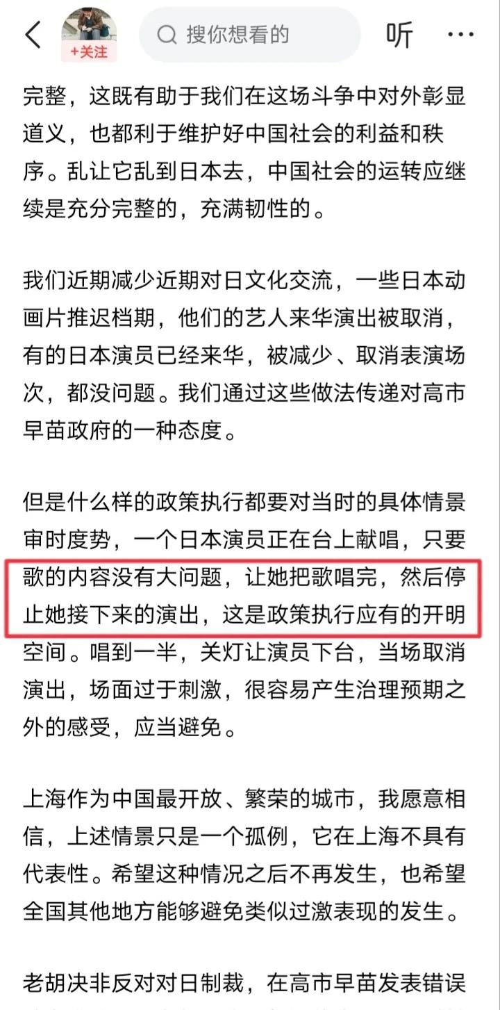 近日,胡锡进发文表示“当众把日籍演员轰下台,这是对演员个人的不尊重”。 不得不说,因为日本政客对我们国格的不尊重,这几天早已出台规定取消日籍演员的国内演出。胡锡进却以“尊重日籍演员个人”的名义,忘记了日本首先不尊重我们的国格。 难道一个日籍演员的个人尊严,竟然大于我们的国格尊严吗?取消日籍演员演出的规定,下发到各地文旅部门,文旅部门不遵守就是文旅部门的失职。文旅部门把取消日籍演出的规定下发给各演出单位,演出单位不遵守就是演出单位的失职。演出单位已经取消了日籍演员的演出安排,现场工作人员仍让日籍演员上台,这就是现场工作人员的失职。 胡锡进不去追究是哪个执行环节出了问题,反而关心日籍演员的个人尊严问题。难道为了维护个别日籍演员的尊严,我们维护国格尊严的举措就要为其退让打折扣吗? 日本每年有数十上百万人参拜靖国神社,胡锡进怎么不去呵斥这些日本人要尊重中国人民的感情呢?现在区区一个日籍演员的个人尊严被冒犯,胡锡进就声嘶力竭地为其打抱不平,老胡难道不晓得孰轻孰重吗?