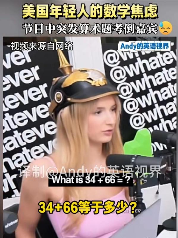 美国年轻人真是厉害。节目中主持人问选手们34+66等于多少。一个纹花了脸的女生说