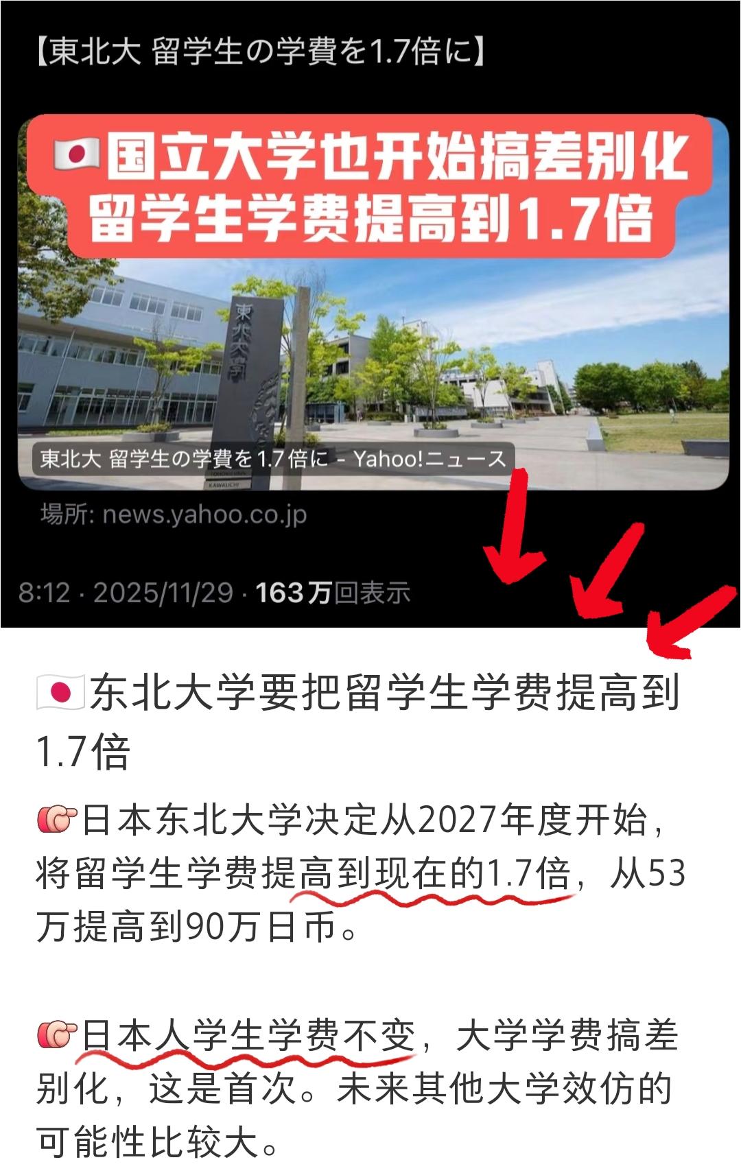 11月29日 日本的反制终于来了! 不是军事行动,而是日本名校拟涨留学生学费70%,年增长1.7万元,而本土学生学费不变。 选日本留学,不就是冲它性价比高、学费便宜吗?业内人都点透了,“廉价留学”才是它的核心标签。现在突然暴涨1.7万,学历含金量本就不如欧美,这下性价比直接跌穿底。 更让人不舒服的是“区别对待”,明明享受一样的教育资源,却要多掏一大笔钱。说是为了覆盖教育成本,倒不如说是想靠留学生创收,吃相实在难看。 这种既想赚留学生的钱,又不愿平等对待的做法,只会把人推走。