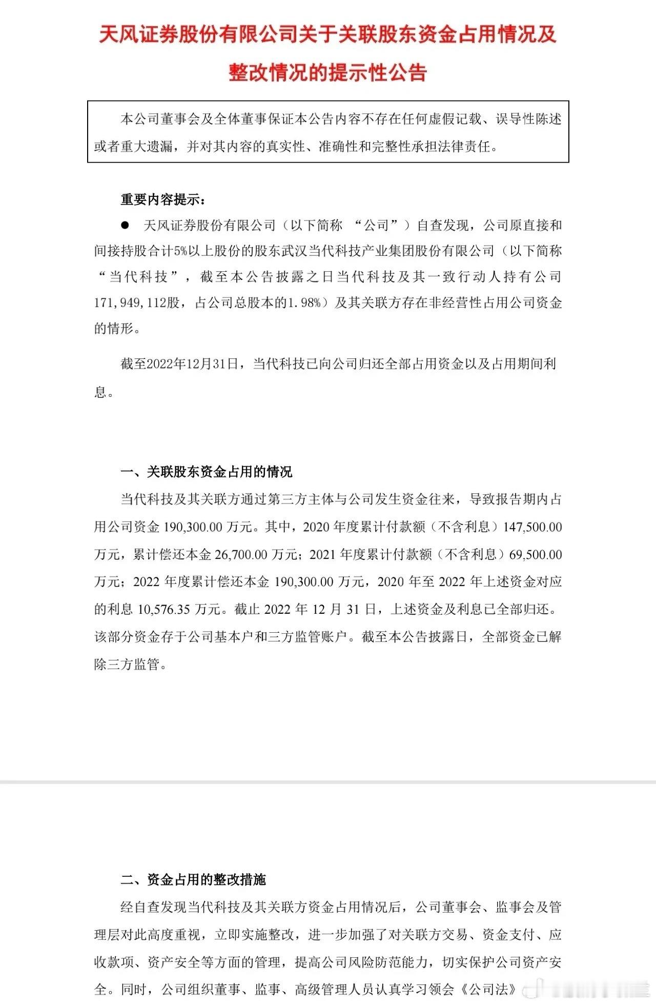 天风证券被立案调查这事,影响可大可小!这种情况影响较小:如果仅仅是2020年至2022年期间,大股东关联占用天风证券资金,违规向大股东及关联方提供融资,没有及时披露,那这种信息披露违法违规,面临的处罚比较轻,也不会对公司产生太大的影响。以下情况影响巨大:天风证券2025年6月份进行了再融资——向特定对象发行14.76亿股A股,融资了40亿元。2021年5月份也进行了再融资,非公开发行20亿股,融资近82亿元。2020年3月份配股14.79亿股,融资53.5亿元。而天风证券股东占用资金发生在2020年至2022年,占用资金19.03亿元。2020年和2021年这两次再融资,有没有披露这些?融资是否合规?融资过程中,是否存在虚假陈述,未披露重要信息?如果不存在这些,问题不大,如果存在这些,你们自己去查查《证券法》会涉及什么?对于上市公司被立案调查这事,投资者要慎重对待,不要自我安慰,不要抱侥幸心理。多看看上市公司过去的公告,综合媒体报道,去分析其中的问题和风险。