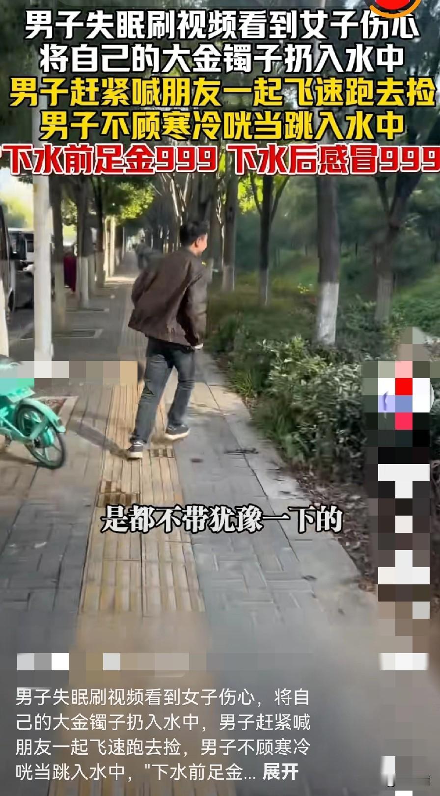 伤心姐姐丢金手镯的后续来了,还真有人去捡“金手镯”,只可惜,姐姐丢的时候足金999,弟弟捡起来却是感冒灵999,附带送上老铁666啊。 近日,一姐姐因爱情郁郁寡欢,伤心之余拍了段视频,丢掉了“渣男”送的金手镯。可没想到这条视频被半夜失眠睡不着觉的一小伙子刷到了。 在这经济大环境这么不好的时候,丢掉了这么大一坨金灿灿的手镯,实在有点可惜了,于是第二天他就叫上了好友,飞奔姐姐丢掉手镯的位置,在这么寒冷的天气下,毅然决然的下水“捞金”了。 皇天不负有心人,好在小伙子对这一带还比较熟悉,打捞上来以后,心拔凉拔凉的,怪不得姐姐丢的这么狠心,不带半点犹豫的,原来这哪里是金镯子,银都不算,就是一坨掉色了的铜手镯啊。 于是小伙子发视频告诉了大家,以后这样对事情不要太相信了。最后还被丢手镯的姐姐刷到,表示愿意请这小伙子吃个饭,毕竟也是一种缘分啊。 小伙子太实在了,满心满眼的捡金子,却没想到捞到废铁了,还是去赴一顿姐姐的饭约吧,有缘千里来相会啊。 (图片来自网络视频)