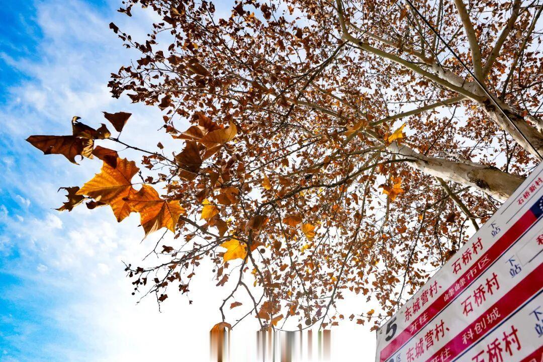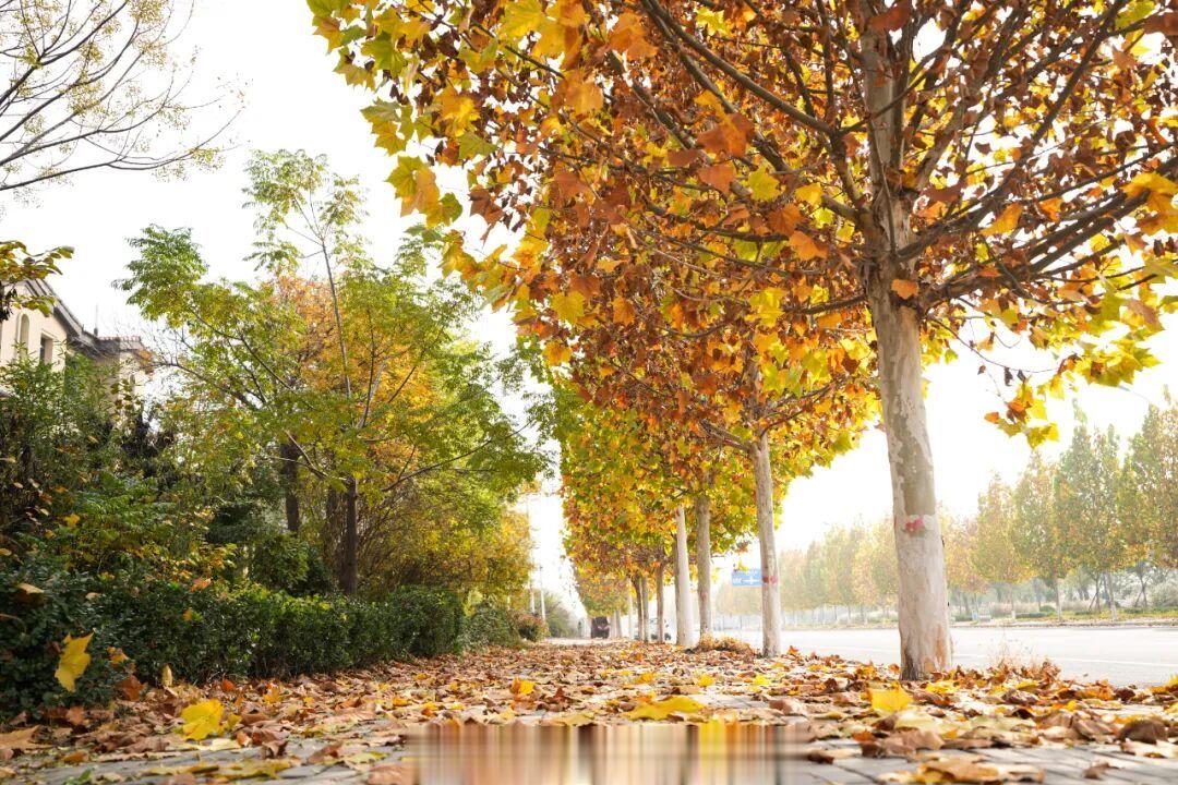 道路两旁的梧桐树陆续由绿转橙
