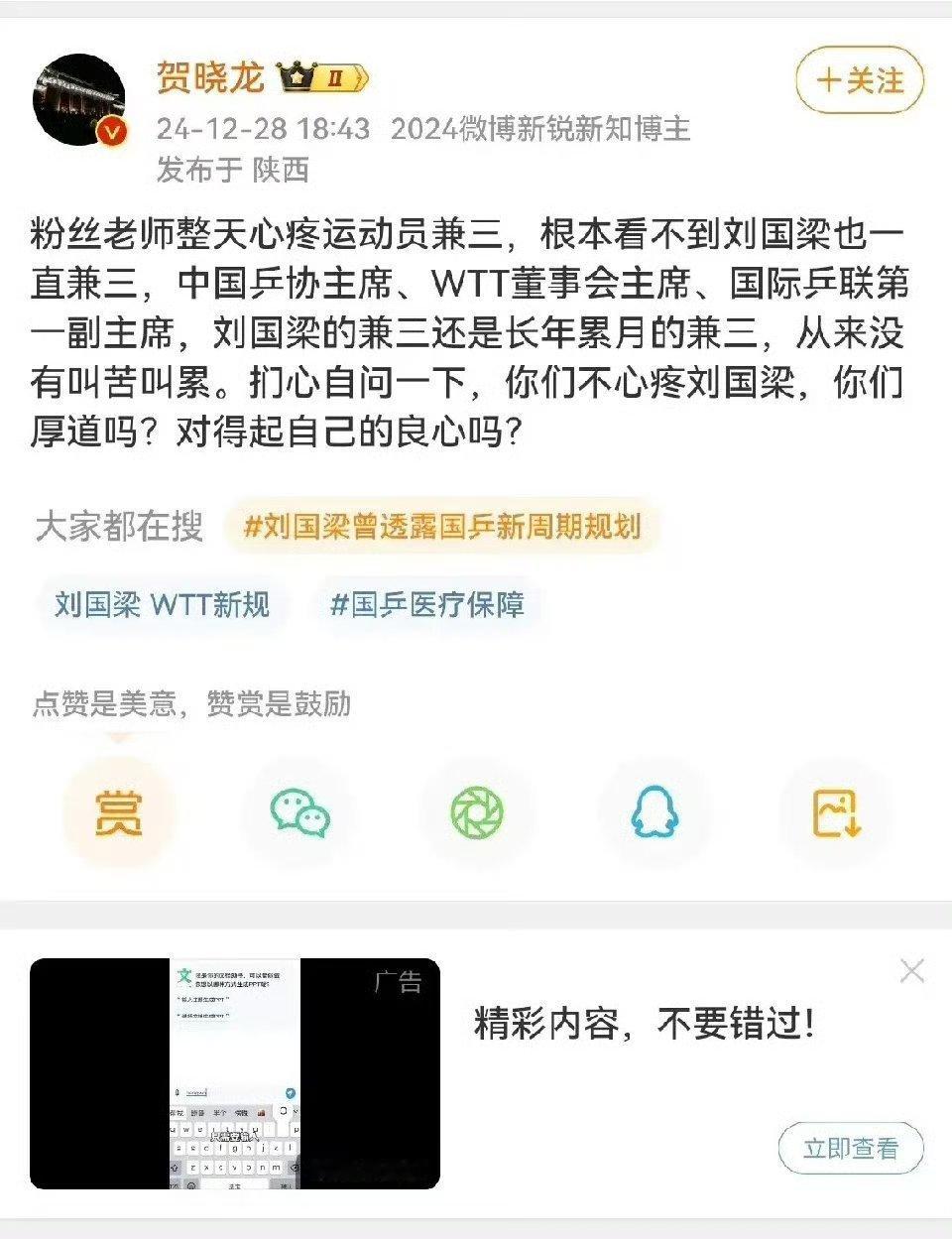 这位贺晓龙真敢说啊,从这个角度,思维突然打开了,刘国梁也确实不容易啊!要带好国乒,尽心尽力负责,向国家交一份满意的答卷;要给资本市场交差,打出成绩,才能不辜负他们的投资;要对运动员们负责,要兼顾老运动员,也要用心培养年轻运动员,给新运动员一些机会。这样也好,老的不去,新的不来,只怕他也操碎了心,不容易啊。