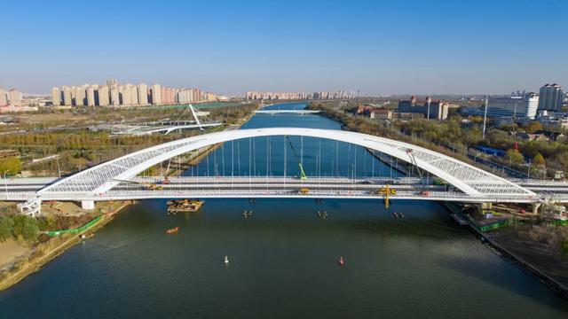 作为海河上游最后一座跨河桥,柳悦桥位于春意桥与吉兆桥间,南起河西规划景新道、北至东丽海河东路,全长964米,采用下承式钢箱“提篮”拱桥结构,钢拱肋重约2500吨。按双向6车道建设,配套非机动车道与人行道,桥宽40至45.5米,建成后河西至东丽往返车程可缩12-15分钟。