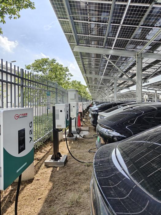 图为在广州的全国最大规模的V2G项目现场,一排新能源汽车正在进行充放电