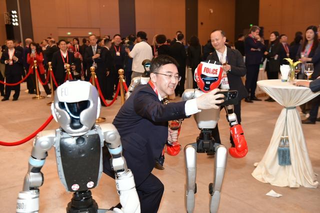 嘉宾也纷纷拿起自己的手机,与拳击选手的人形机器人合影留念。