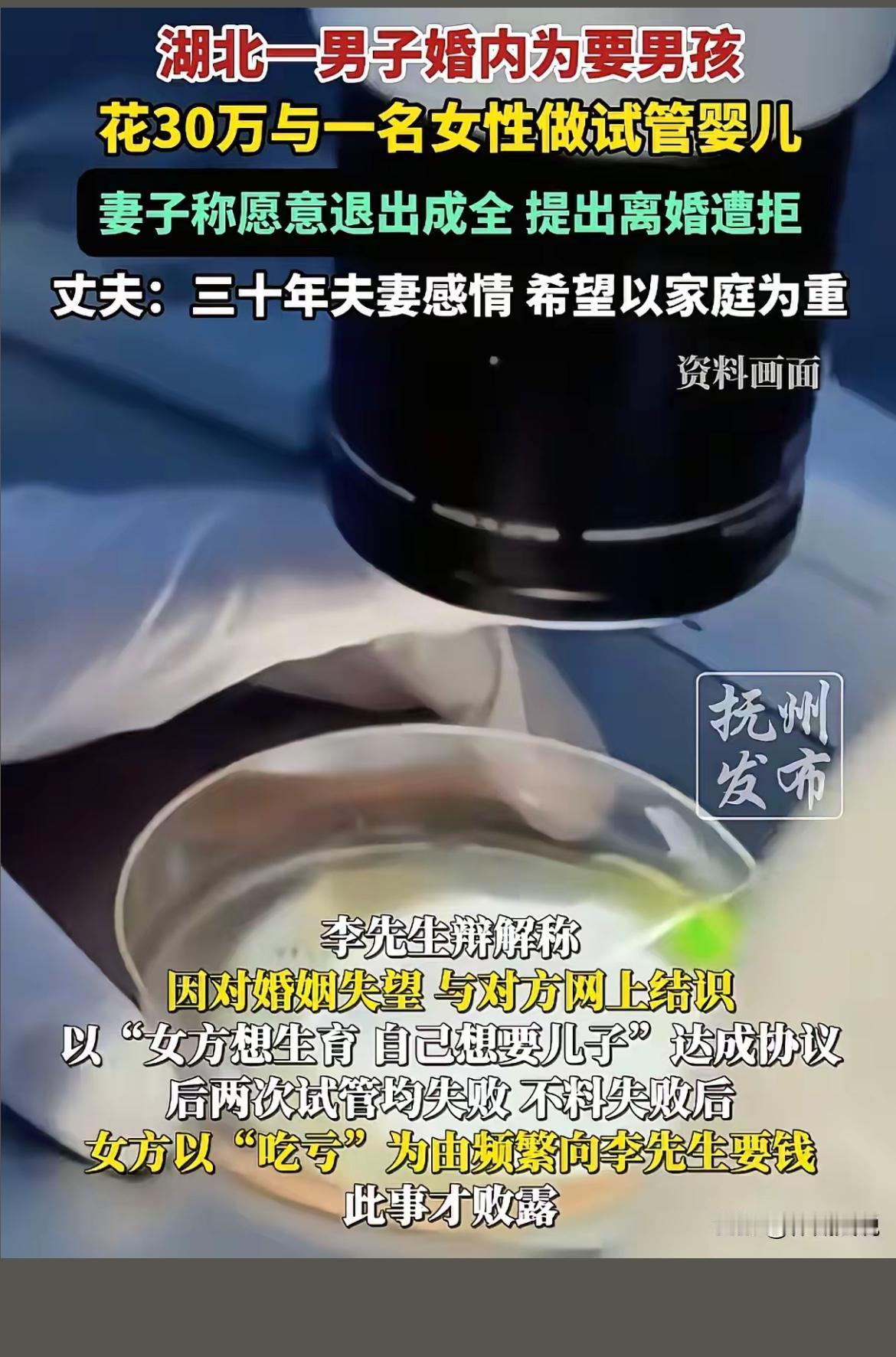 这湖北男子的操作真是让人惊掉下巴。王女士和李先生有30年婚姻,还一起经营餐馆,王女士为家庭付出这么多,结果却落得如此下场。这李先生倒好,为了要男孩,花30万和女网友做试管婴儿。先不说这行为违背伦理道德,就说王女士多年的真心错付,得多心寒啊。这也给大家提了个醒,婚姻里要是有人这么不珍惜,那这婚姻也就变味了。王女士提出离婚太明智,及时止损,远离这种不靠谱的人,总比继续在这糟心事里耗着强。