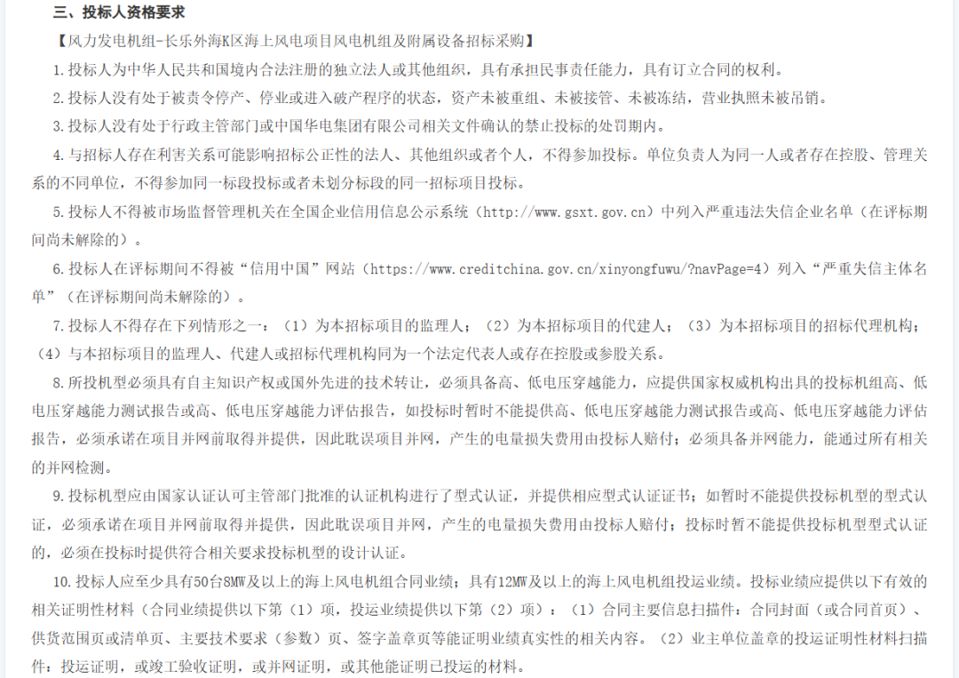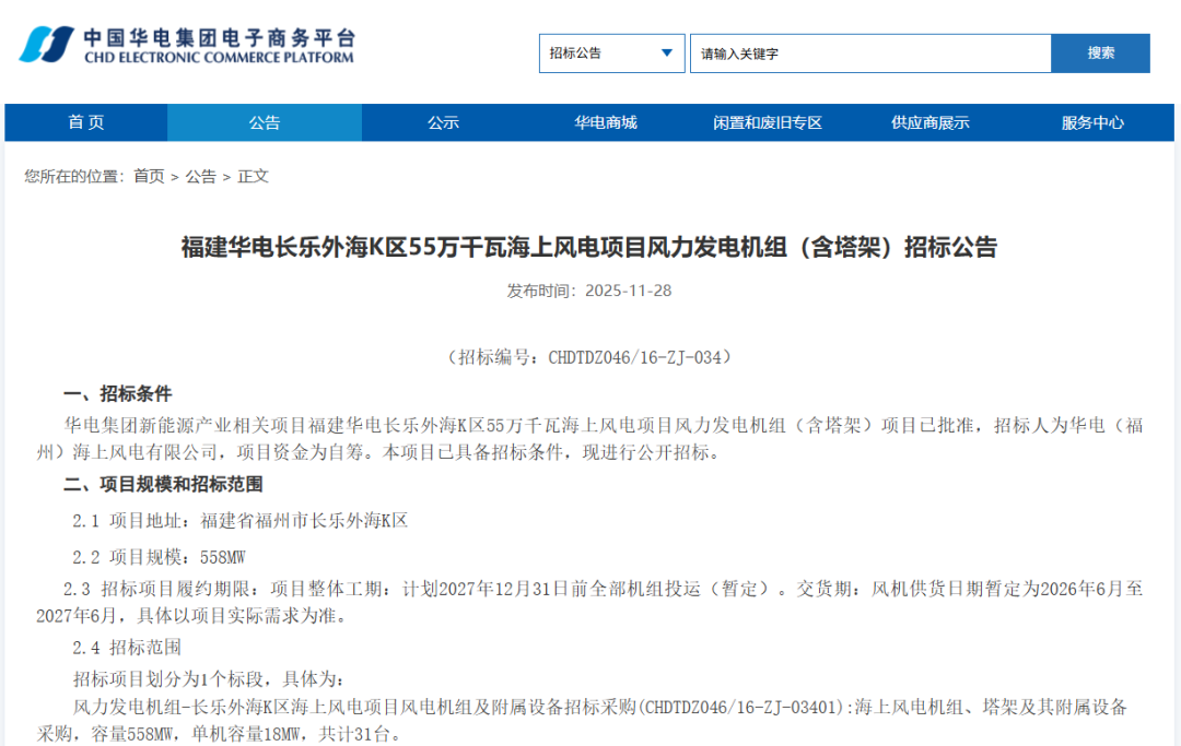风芒能源获悉,11月28日,中国华电集团电子商务平台发布《福建华电长乐外海K区55万千瓦海上风电项目风力发电机组(含塔架)招标公告》。