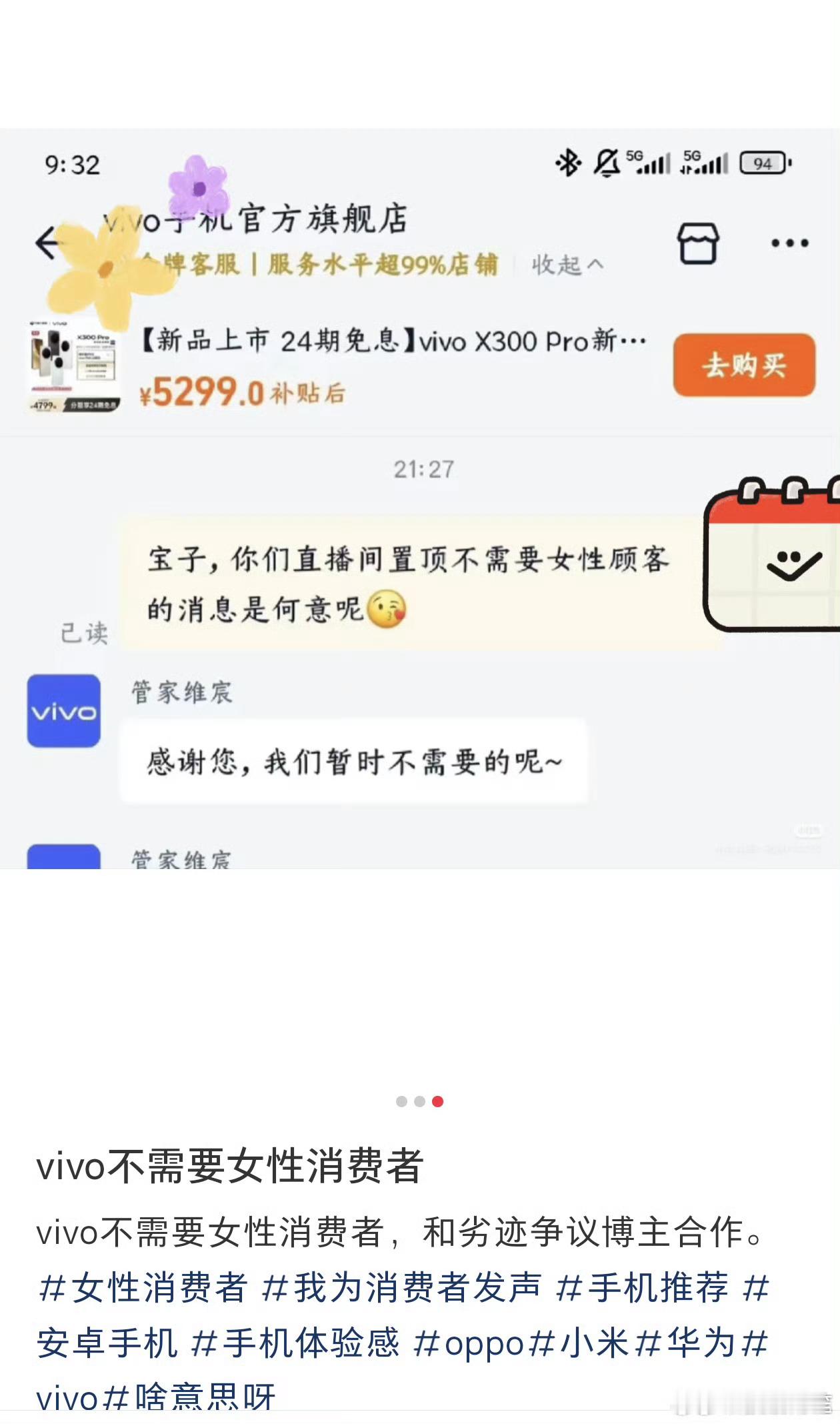 去年想换手机的差点就买了vivo,还好没买最后等到了荣耀400……竟然不需要女用户吗,离谱 vivo被曝直播间置顶不需要女用户评论