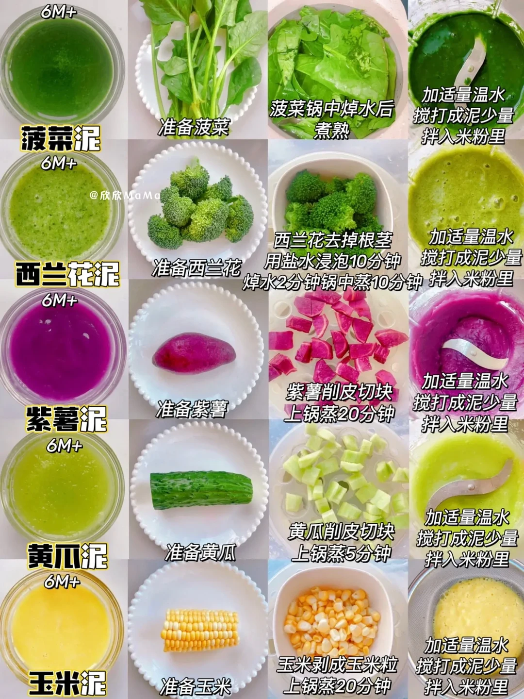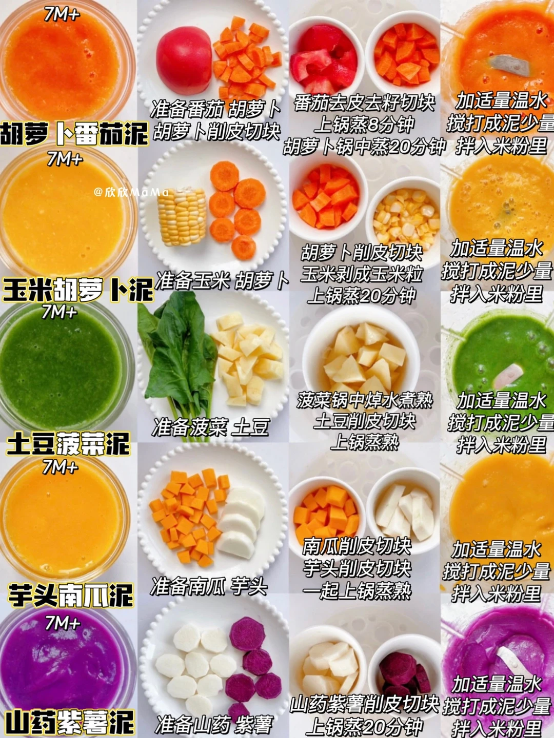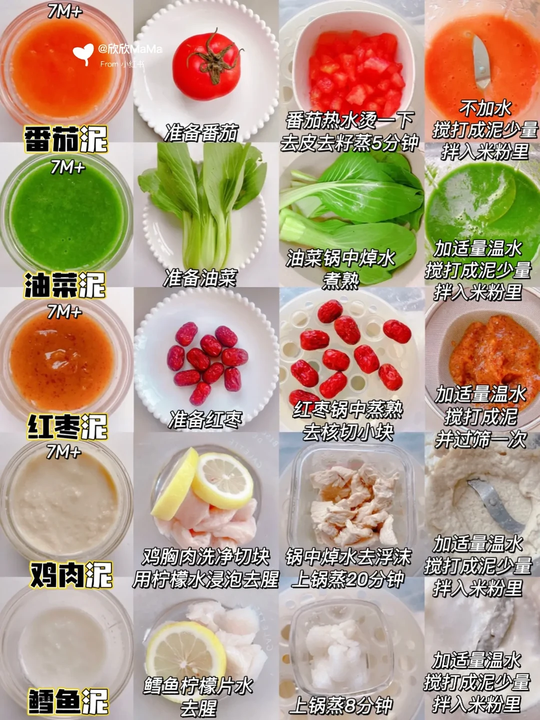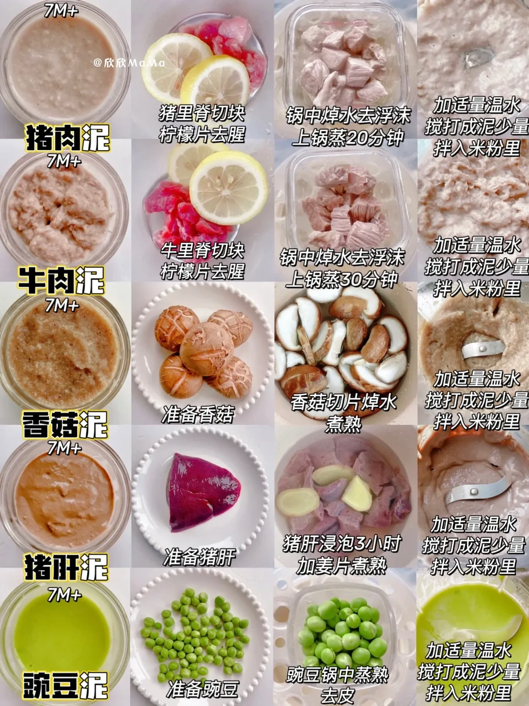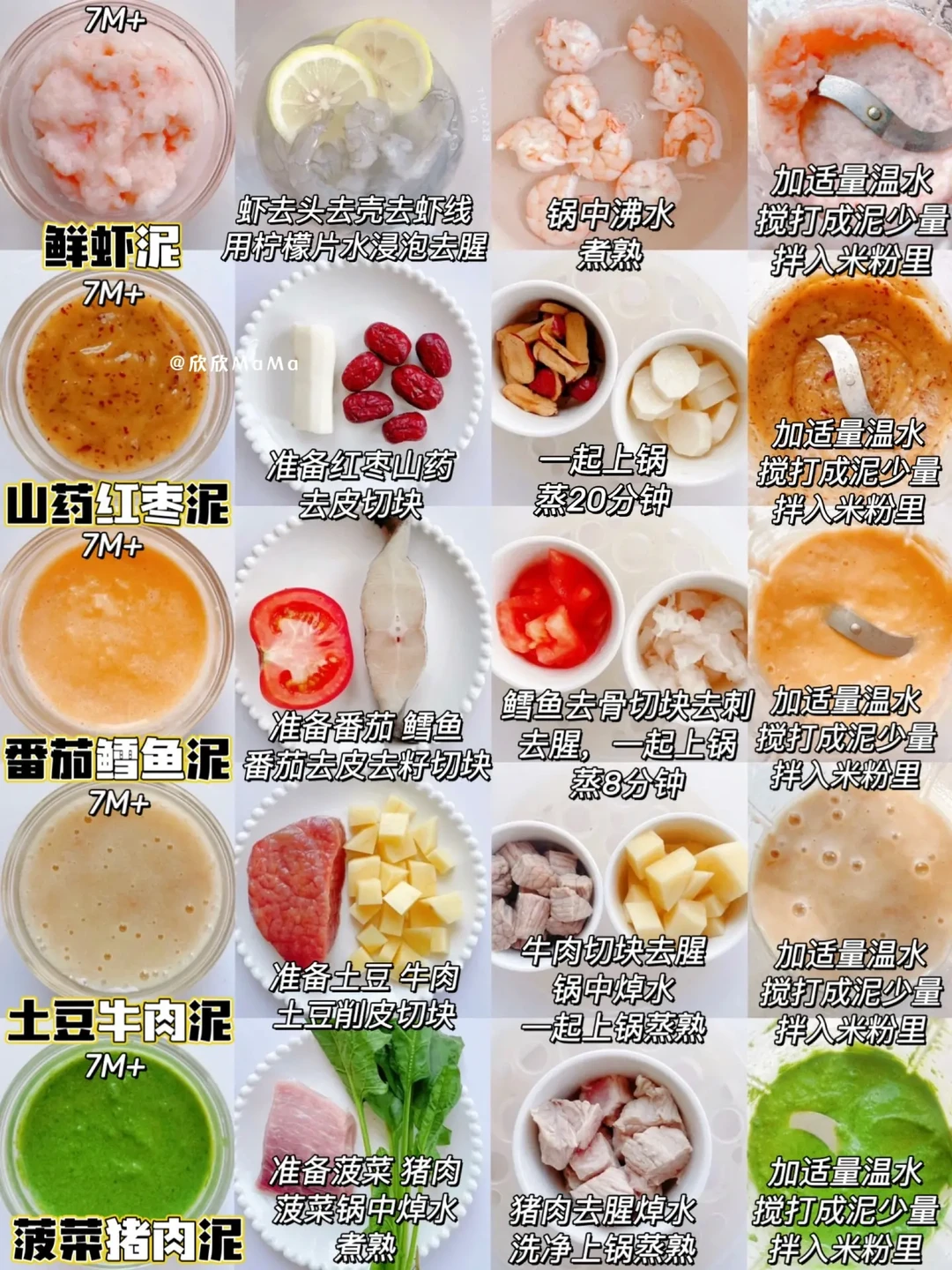 ⚠️每添加一种食材3天排敏期,食材都拌入米粉里滴入辅食油搅拌食用,排敏过的食物可混合吃,水果泥单独吃!