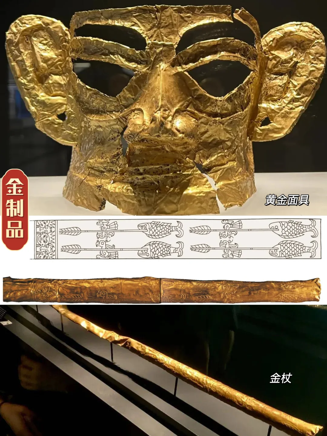 🐟还有金杖,是金条捶打成皮后,再包卷于木杖做成的,上面刻有鱼、鸟以及人头像,令人联想到上天入地的神化魔力。