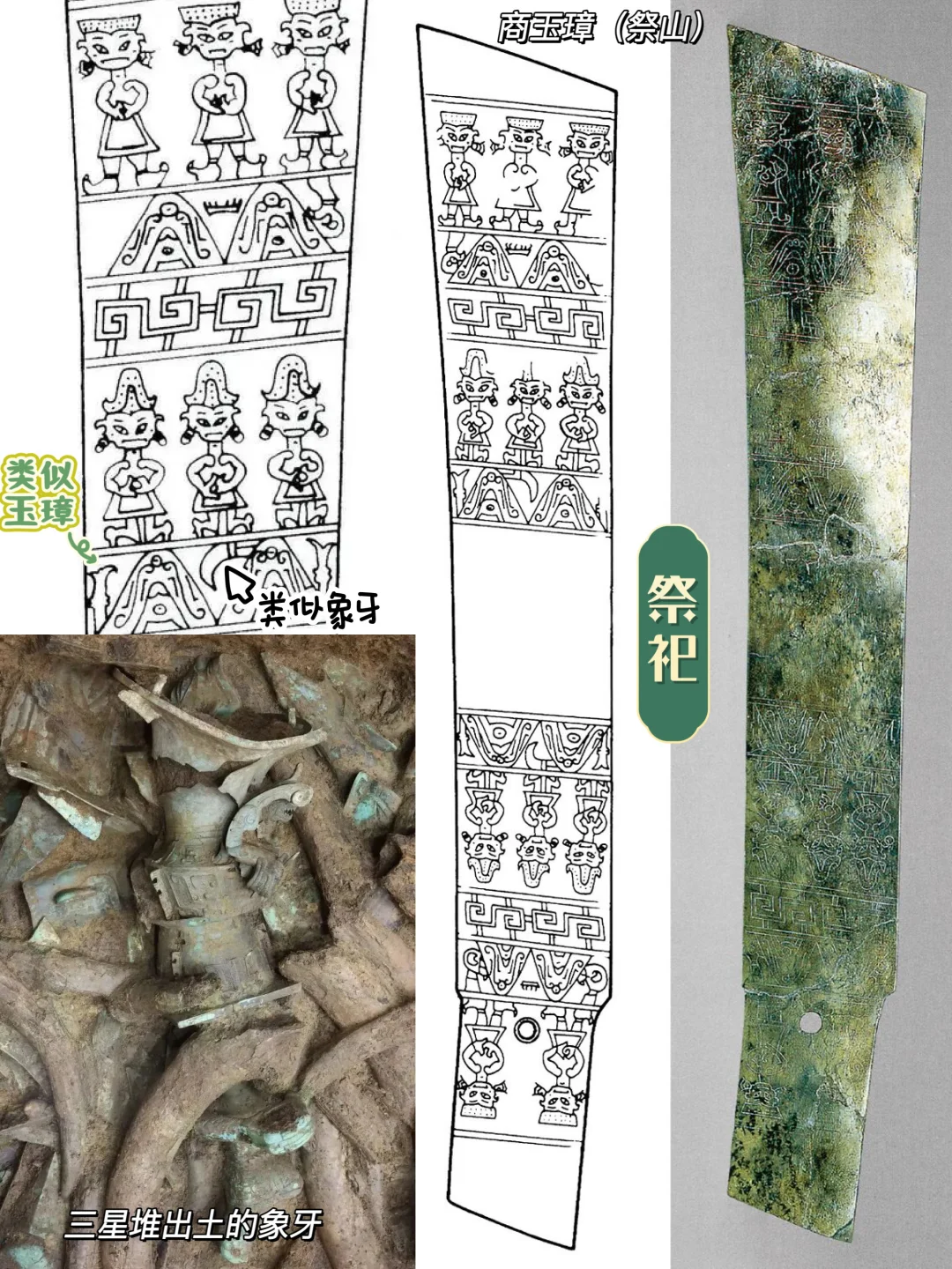 ☀️虽不可知,但有件玉璋却阐明了祭山之礼。如雕刻所示,山中插着弯形尖状物,人们正向其跪拜。