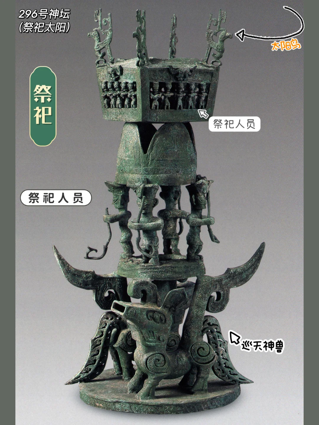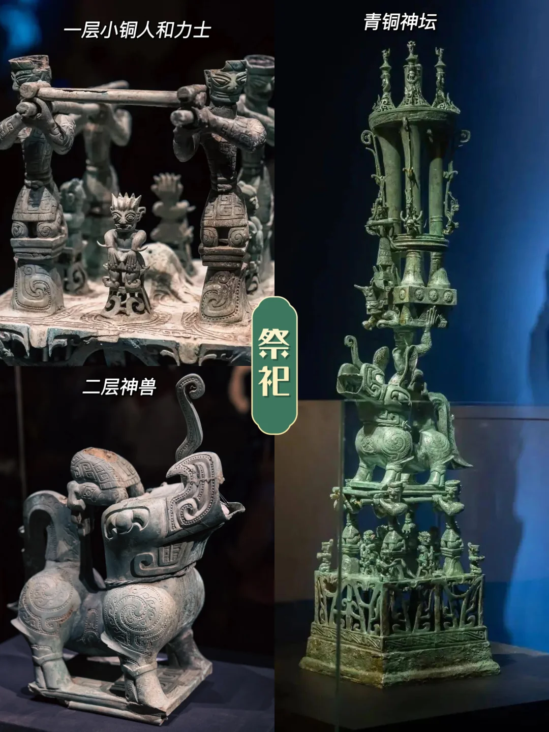 ☀️这些崇拜,经由祭祀传递出来,三星堆有一座青铜神坛,便展现了如此场景,第一层跪坐着9个小铜人和四位抬杠的高个儿力士。