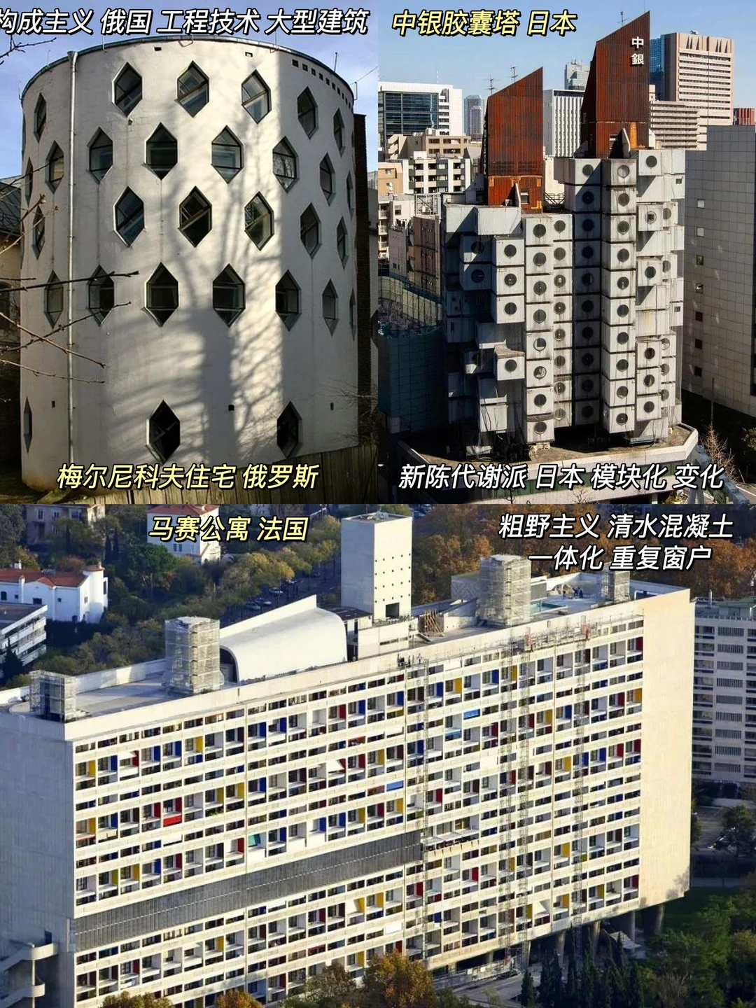 这一时期,全世界都在向现代设计靠拢。✨俄国构成主义以大型工程建筑宣扬出社会进步的理念;✨法国粗野主义用清水混凝土材料做出对精细外观的回应;✨日本新陈代谢派以模块拼接化造型传递出日式文化的韵律。
