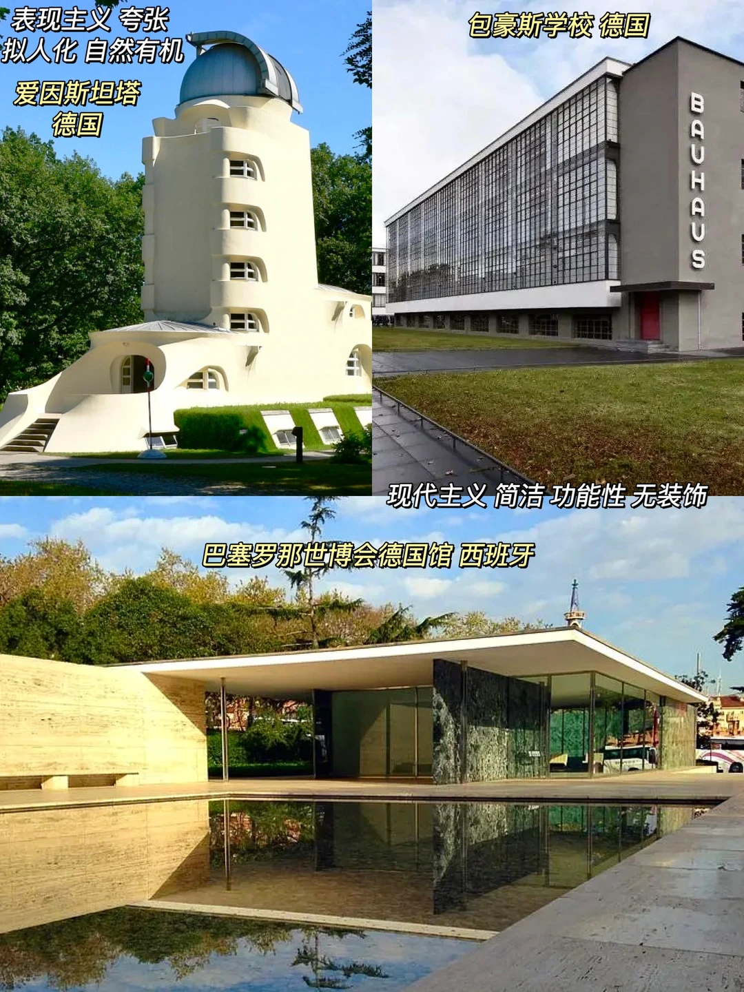 🔹时间来到20世纪德国,通过夸张、拟人化形态抒发情感的✨表现主义建筑大行其道。随后追求极简、拒绝装饰、强调功能性,使用玻璃、钢铁和混凝土材料的✨现代主义又占据上风,并诞生出包豪斯学校、巴塞罗那世博会德国馆等经典建筑。