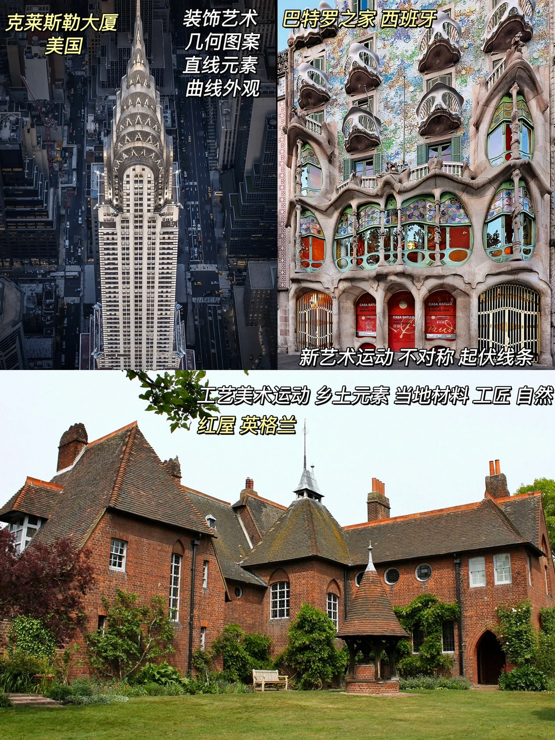 🔹很快,接连三个艺术运动又让建筑往前迈进了一大步。✨工艺美术运动推动了民居对乡土元素的广泛运用;✨新艺术运动促进了建筑对自然、流动形态的有机结合,✨装饰艺术不仅外观华丽,还显现出几何、直线等现代审美特征。